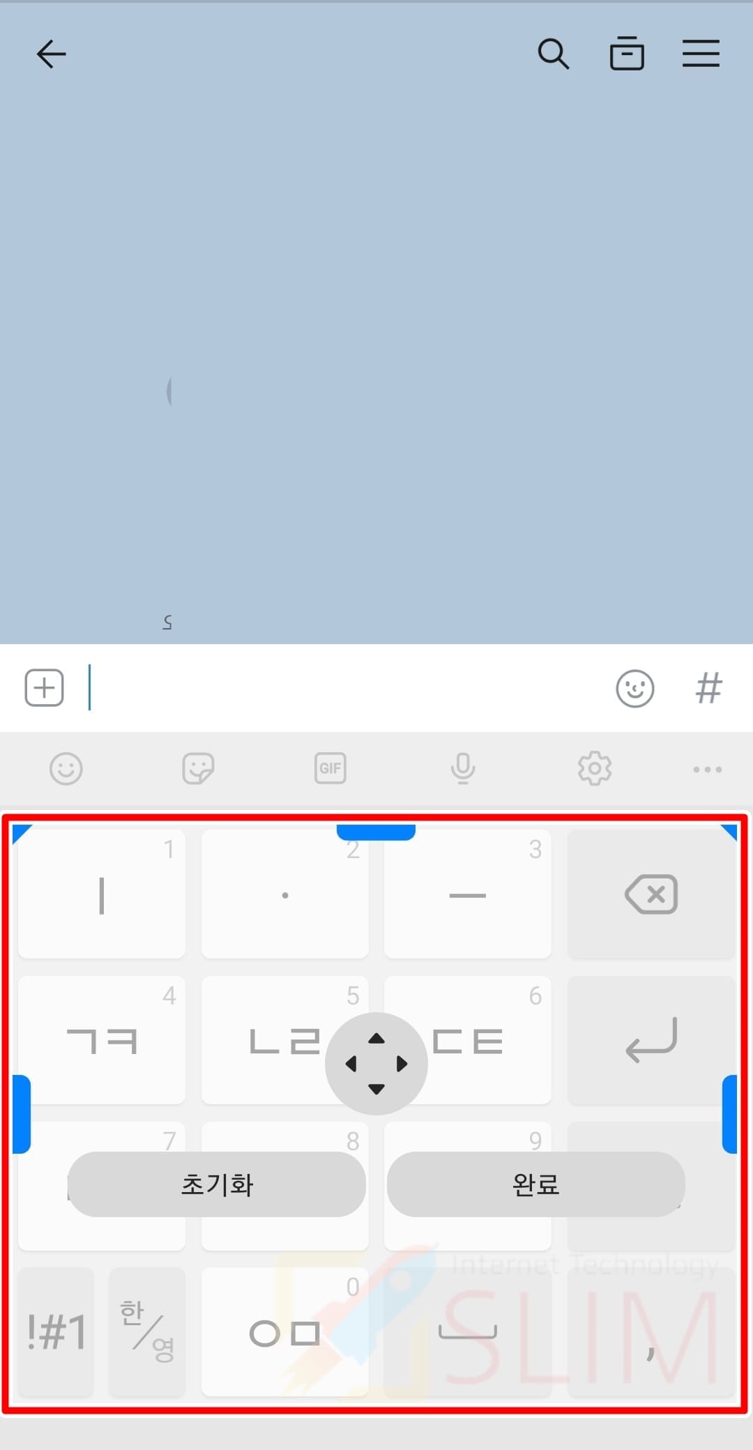 키보드 크기를 조절하셨다면 중앙에 있는 화살표 버튼을 눌러서 키보드를 중앙으로 맞춰주시면 됩니다. 위 사진처럼 중앙정렬을 하셨다면 완료버튼을 클릭하시면 적용됩니다. 참고로 갤럭시 기본 키보드 크기로 다시 돌아가고 싶으시다면 '초기화' 버튼을 클릭하시면 됩니다. 그러면 이제 실제로 타이핑할 때 키보드 크기가 어떻게 보이는지 확인해보겠습니다.