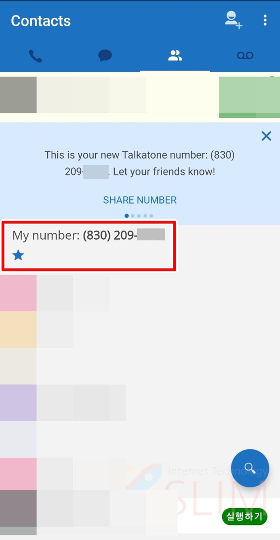 앱의 어떤 메뉴에서든 상단에 My number가 표시됩니다. 저의 번호는 (830)-209-xxxx 형식으로 되어있는데요. Talktone 가상번호는 미국이기 때문에 앞에는 +1이라는 국가번호가 부여됩니다. 이제 그대로 카톡 앱 입력해서 문자인증을 받아보겠습니다.