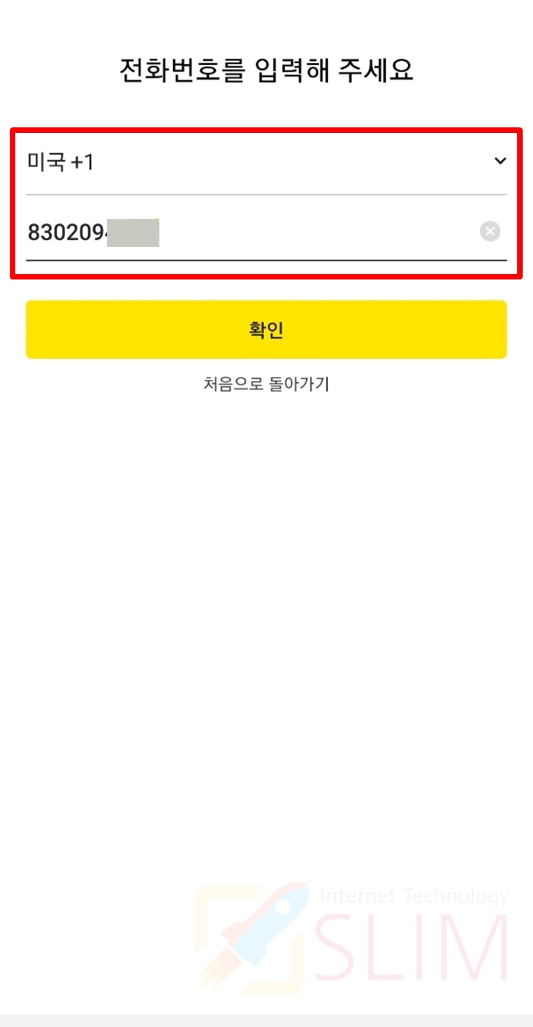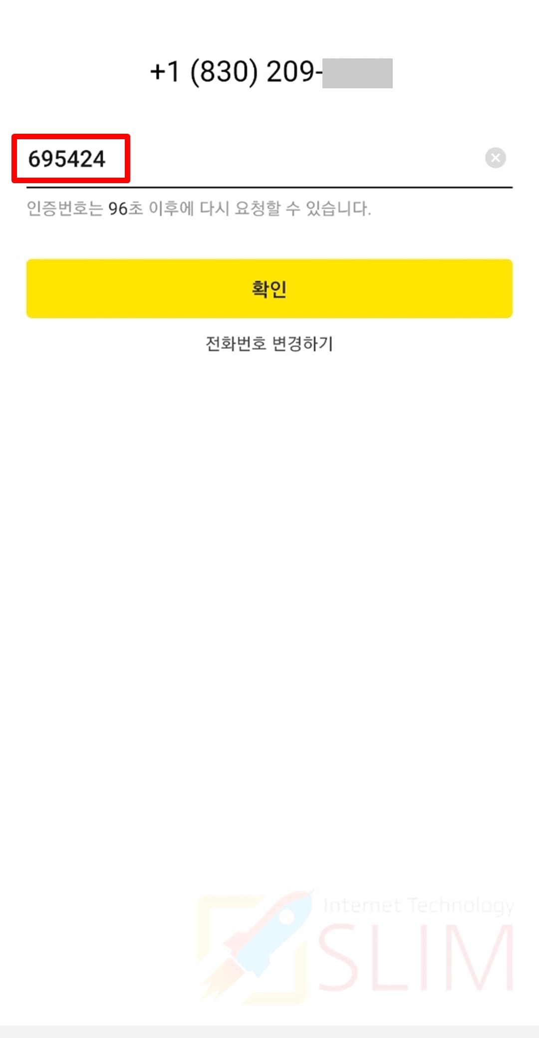15. 카톡 앱에서 문자 인증번호를 입력 후 확인을 누르세요.