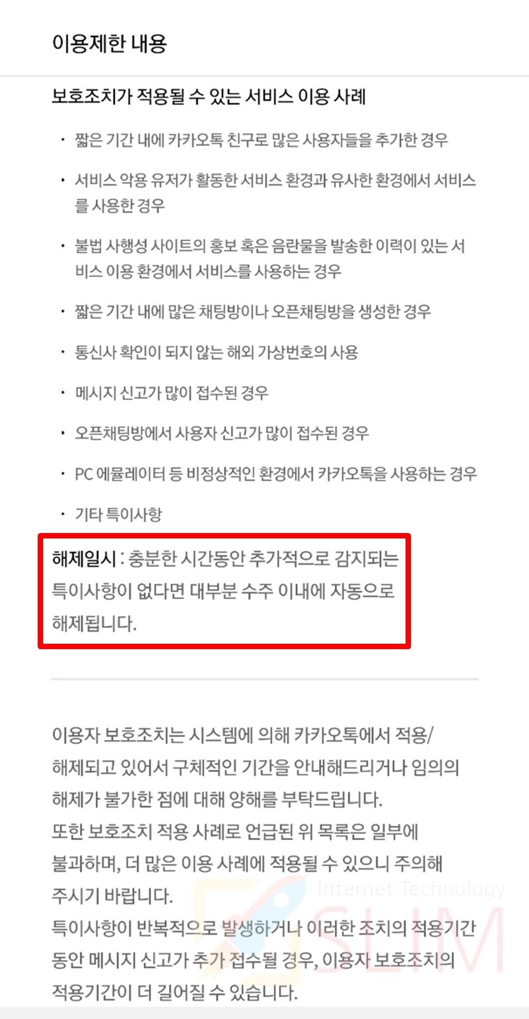 제가 직접 테스트를 해본 결과 약 2주~3주 정도가 소요되면 이용자 보호조치가 해제되면서 정상적으로 친구추가나 메시지보내기, 오픈채팅방 참여 등의 카톡 기능을 사용할 수 있었습니다. 참고하시길 바랍니다.