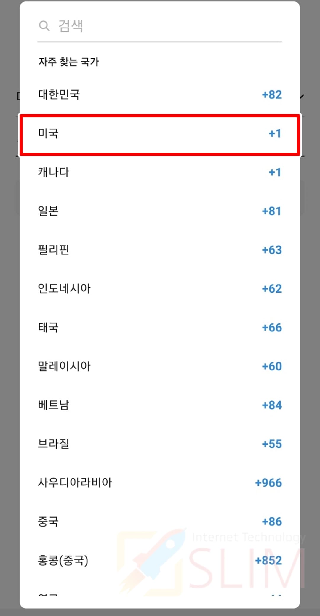9. 카톡 앱에서 국가를 미국+1로 선택합니다.