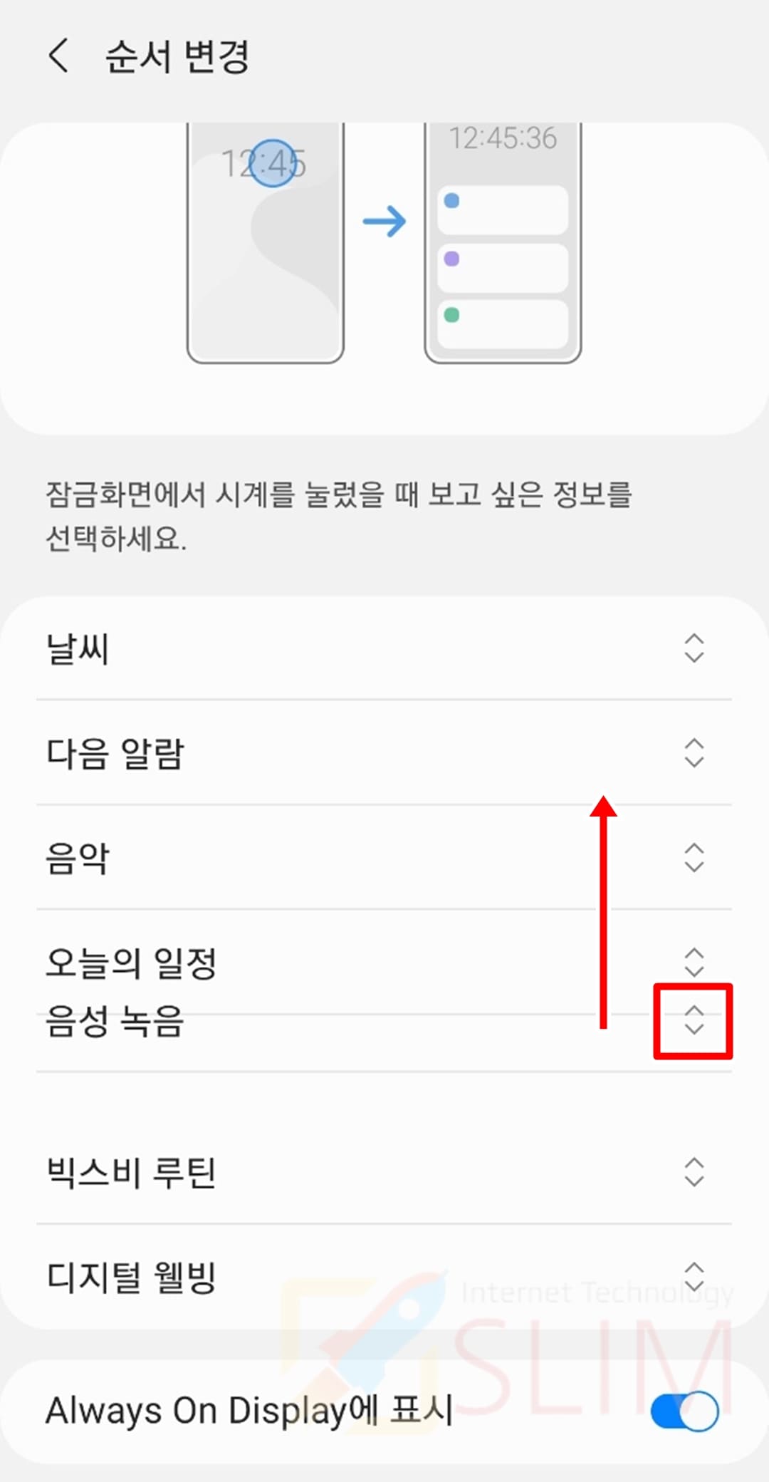저는 언제든 빠르게 찾아서 녹음을 하기 위해서 잠금화면 위젯의 첫번째를 음성녹음으로 바꿔주었습니다. 이렇게 위 목록으로 순서를 확인하신 후 설정 앱을 꺼주시면 되는데요. 별도로 저장버튼이 없어서 순서만 바꾸면 그대로 반영됩니다. 이제 어떻게 갤럭시 잠금화면 녹음 기능을 사용하는지 알아보도록 하겠습니다.