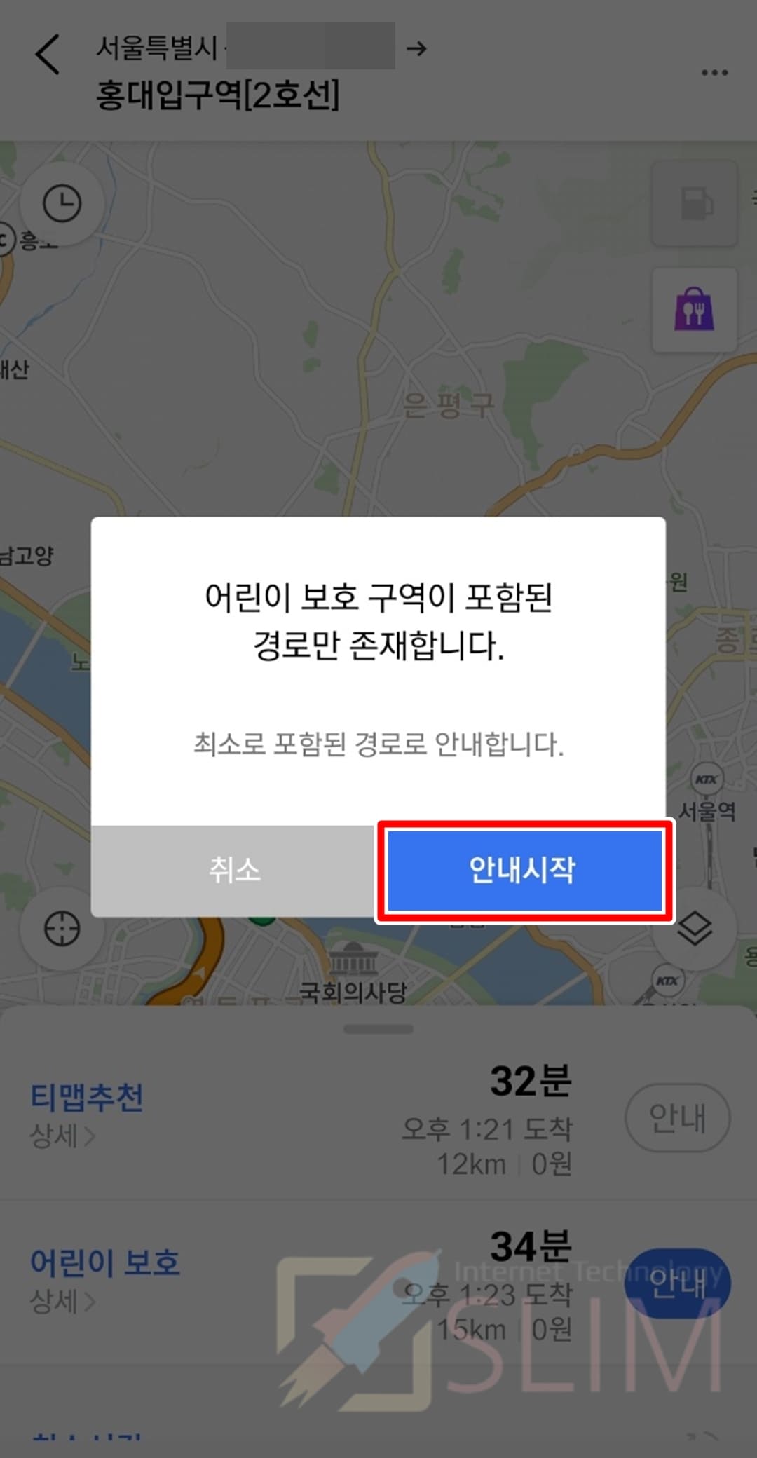 어린이 보호 경로를 설정하면 출발지-목적지간 스쿨존을 우회하게 됩니다. 단, 경로상 어린이보호구역(스쿨존)을 피할수가 없다면 위 사진처럼 안내 창이 뜨게 되는데요. 최대한 스쿨존 우회로 안내해주지만 어쩔 수 없이 지나칠 수 밖에 없는 스쿨존에서는 안내 목소리로 경고해주게 되니 미리 운전에 주의해주시면 됩니다.