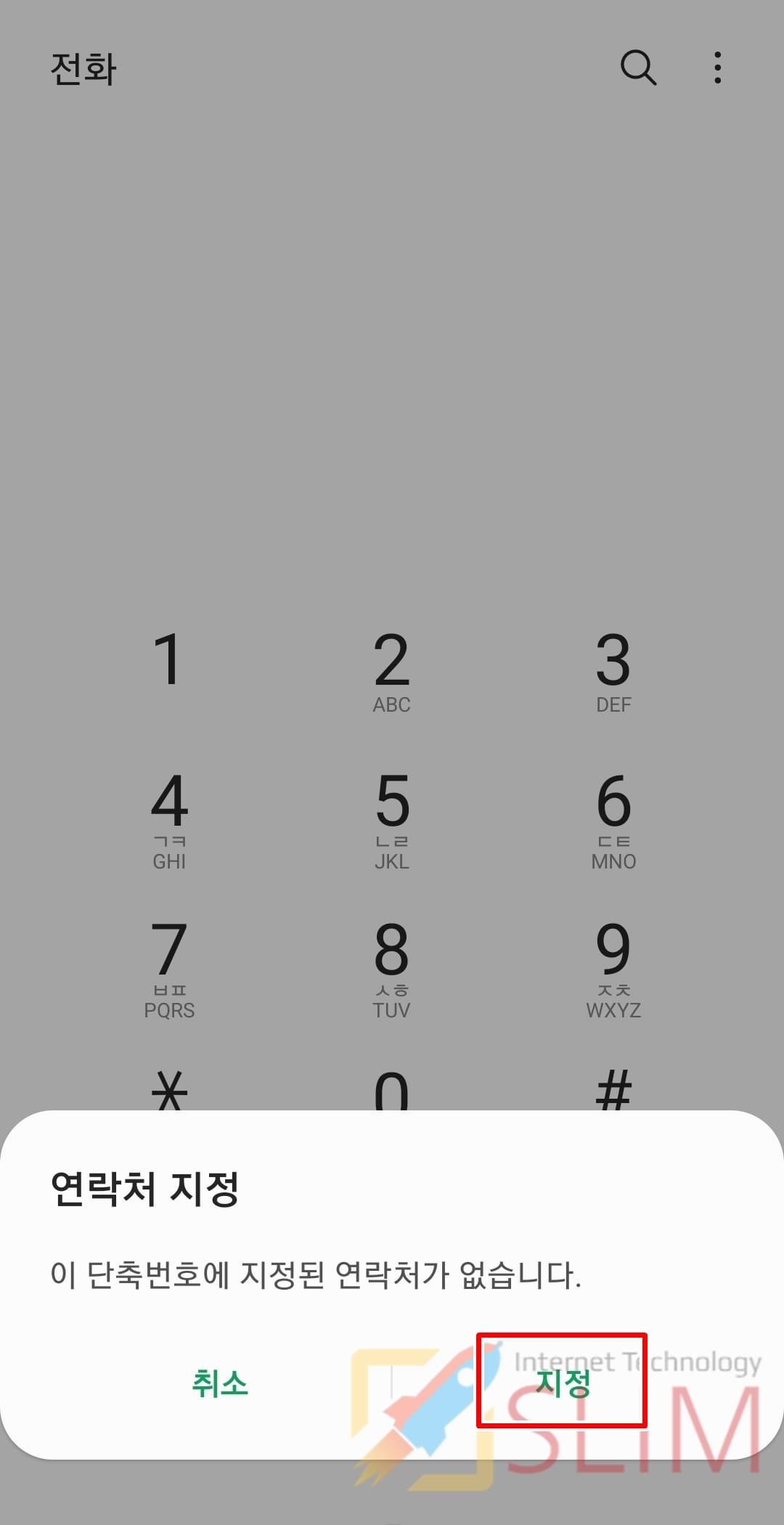 2. 단축번호에 지정된 연락처가 없다는 알림이 나오면 지정을 클릭합니다.