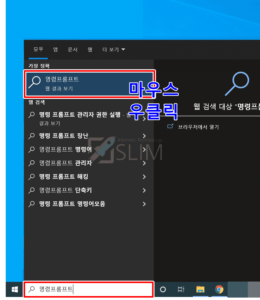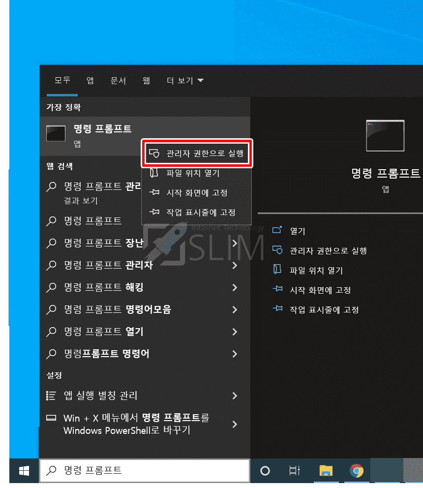 3. 검색된 명령프롬프트를 마우스 우클릭합니다.