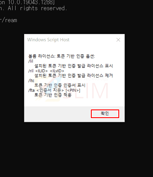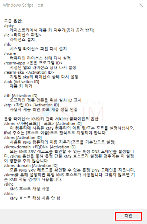 위 명령어를 입력하고 엔터를 치자마자 팝업창이 뜨게 되는데요. 총 5개의 창이 뜨게 되며 윈도우10 라이센스, 정품인증 관련 주의사항들을 안내해줍니다. 모두 확인을 눌러서 닫아주시면 됩니다.