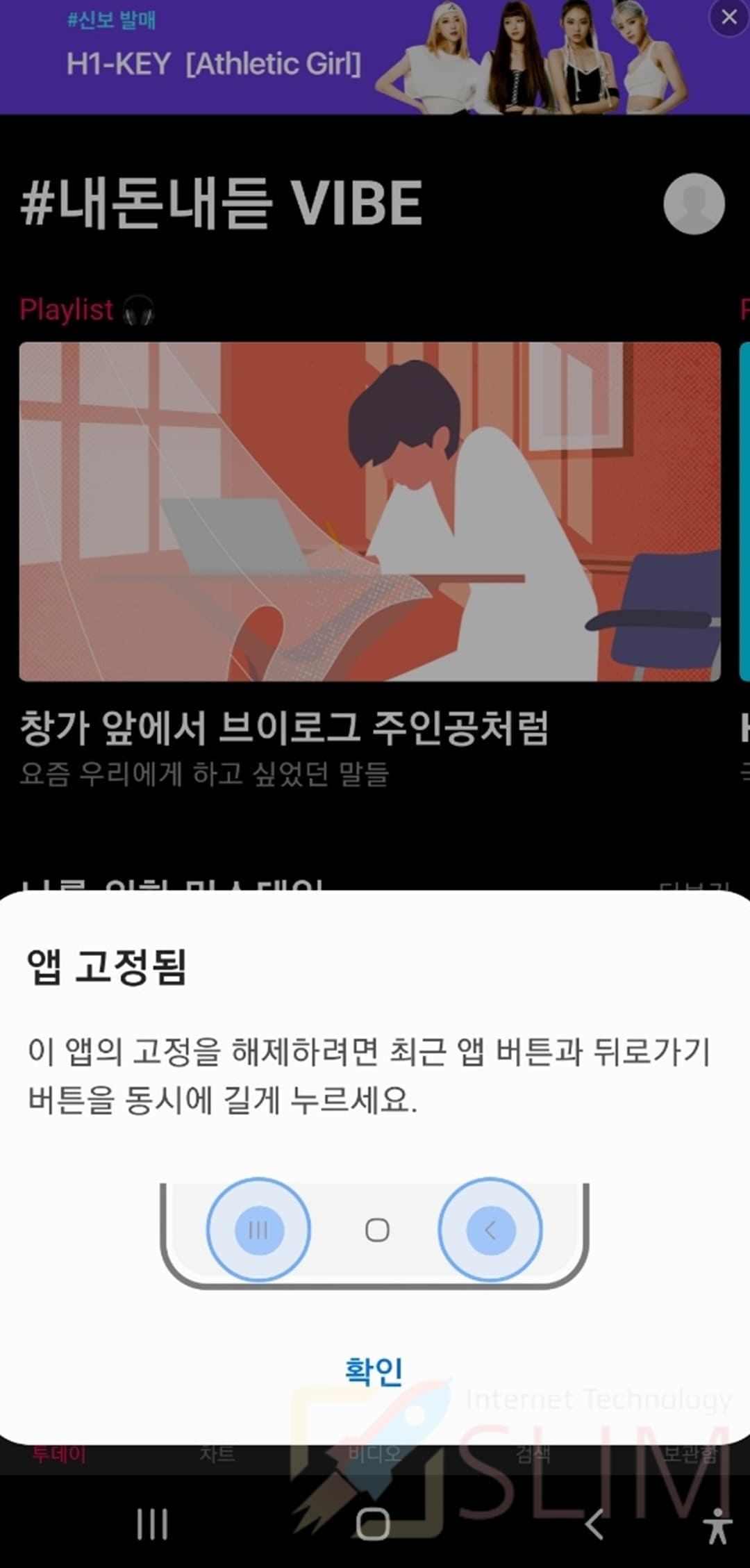 ▲ 이 앱 고정을 누르면 위 사진과 같이 선택한 앱이 전체화면에 고정되는데요. 이 앱의 고정을 해제하기 위해서는 최근 앱 버튼과 뒤로가기 버튼을 동시에 눌러야만 합니다. 이렇게 해제를 하지 않은상태에서는 어떤 방법으로도 앱을 화면에서 없앨 수 없습니다. 이러한 화면 고정 방법이 궁금하시다면 갤럭시 앱 잠금 설정 방법 (화면에 선택 앱 고정하기) 글을 읽어보세요.