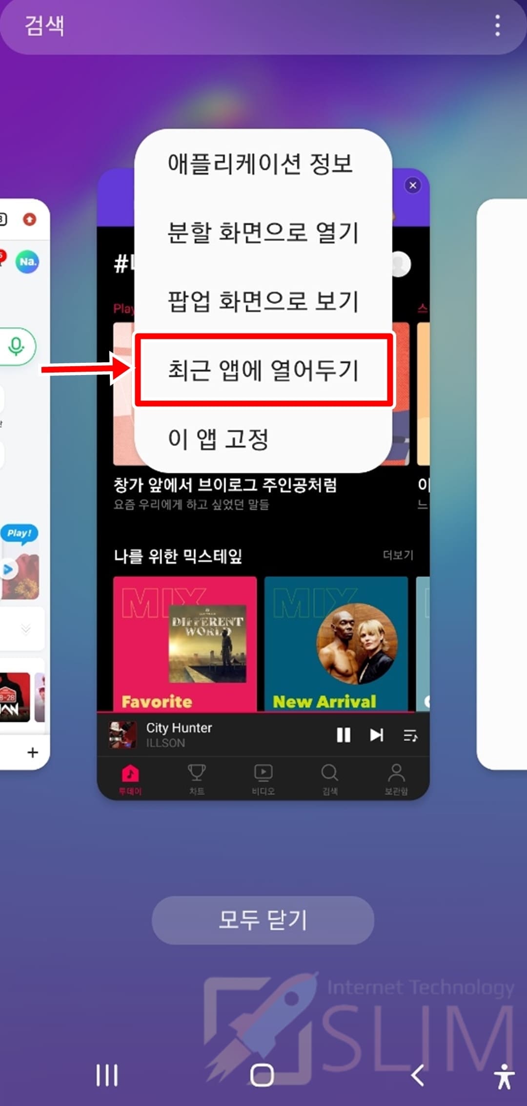 그래서 갤럭시 최근 앱에 열어두기(목록 잠금 고정)시 백그라운드에서 계속 재생해서 사용하는 음악 앱을 최근 앱 목록 잠금 고정을 할 경우 모두닫기를 눌러도 꺼지지 않아서 계속 노래를 들을 수 있습니다. 또 내가 수시로 이용하는 앱의 경우 완전히 닫고, 다시 실행할 경우 로딩시간이 생기게 되는데, 이런 앱을 최근 앱 고정을 할 경우 언제든 빠르게 화면에 실행시켜서 이용할 수 있다는 장점도 있습니다.