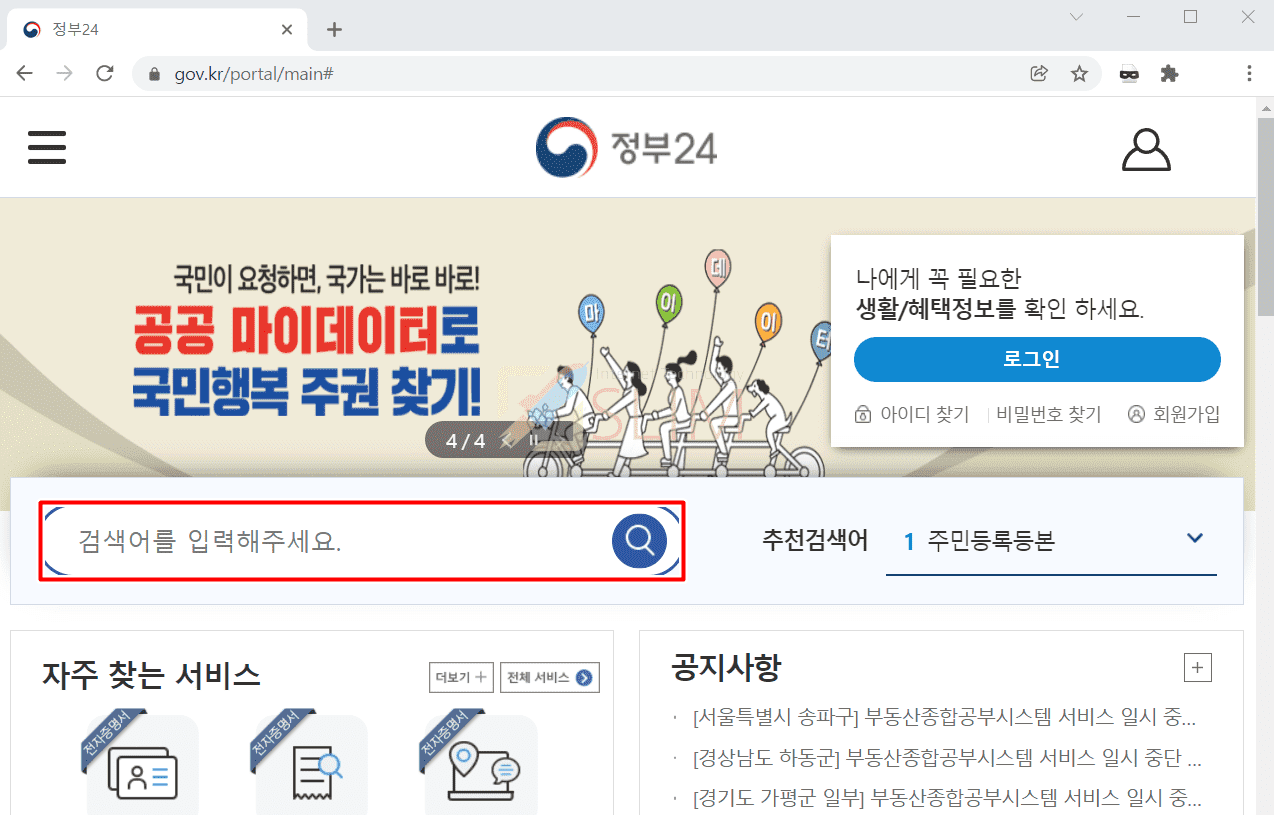 1. 컴퓨터에서 정부24 사이트를 실행합니다.