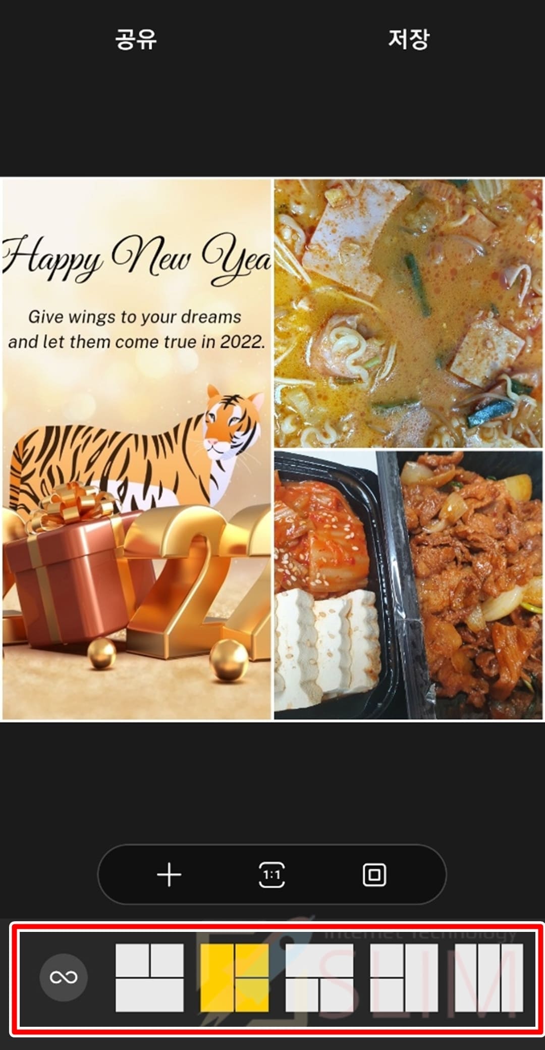 처음 콜라주를 누르자마자 위 사진처럼 사진 합치기가 자동으로 설정되서 보여지는데요. 그대로 사용하셔도 무방하지만 하단에 보여지는 콜라주 배치 디자인을 골라서 설정하는 것도 가능합니다. 우측으로 넘기면 더 많은 디자인을 볼 수 있으니 모양을 골라보세요.