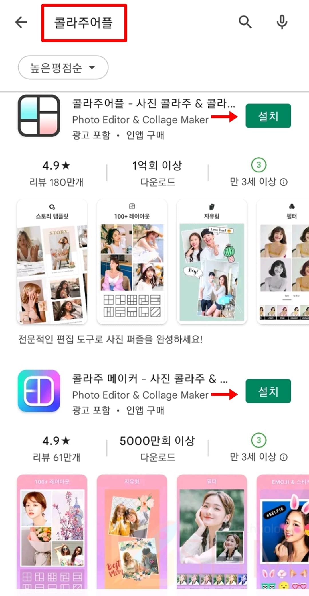 구글 플레이스토어에서 '사진 합치기'를 검색하시면 다양한 콜라주 앱들을 확인할 수 있습니다. 설치 후 무료로 사용하시면 되는데요. 제가 생각하는 장점은 아래에서 서술해보도록 하겠습니다.