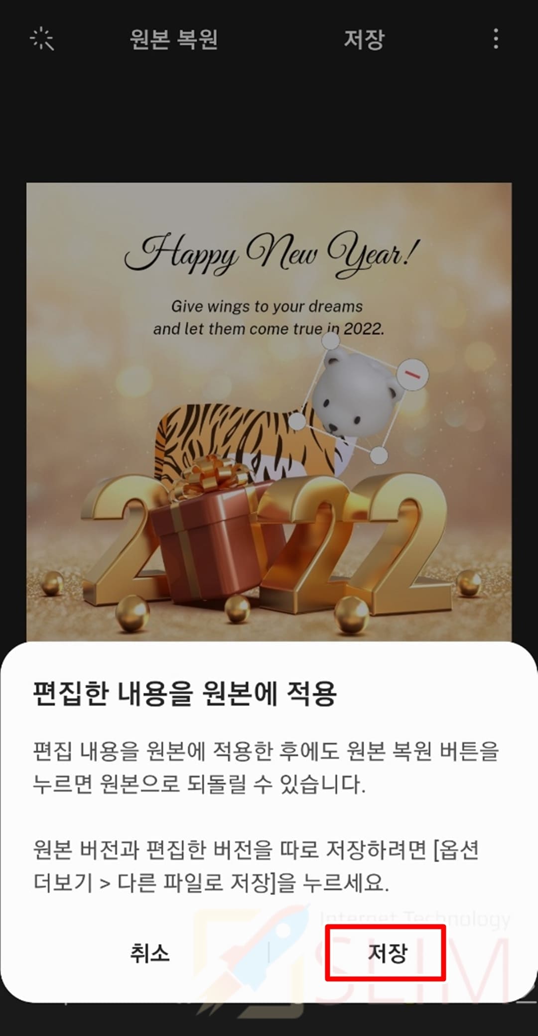 곧바로 처음 설정한 사진위에 편집한 사진이 붙혀지는데요. 저는 호랑이 얼굴을 제 마스코트인 곰돌이 인형으로 바꿔보았습니다. 사용된 편집 기능은 적절한 크기 설정 및 회전만 사용한 결과입니다. 모두 되셨다면 저장해주세요.