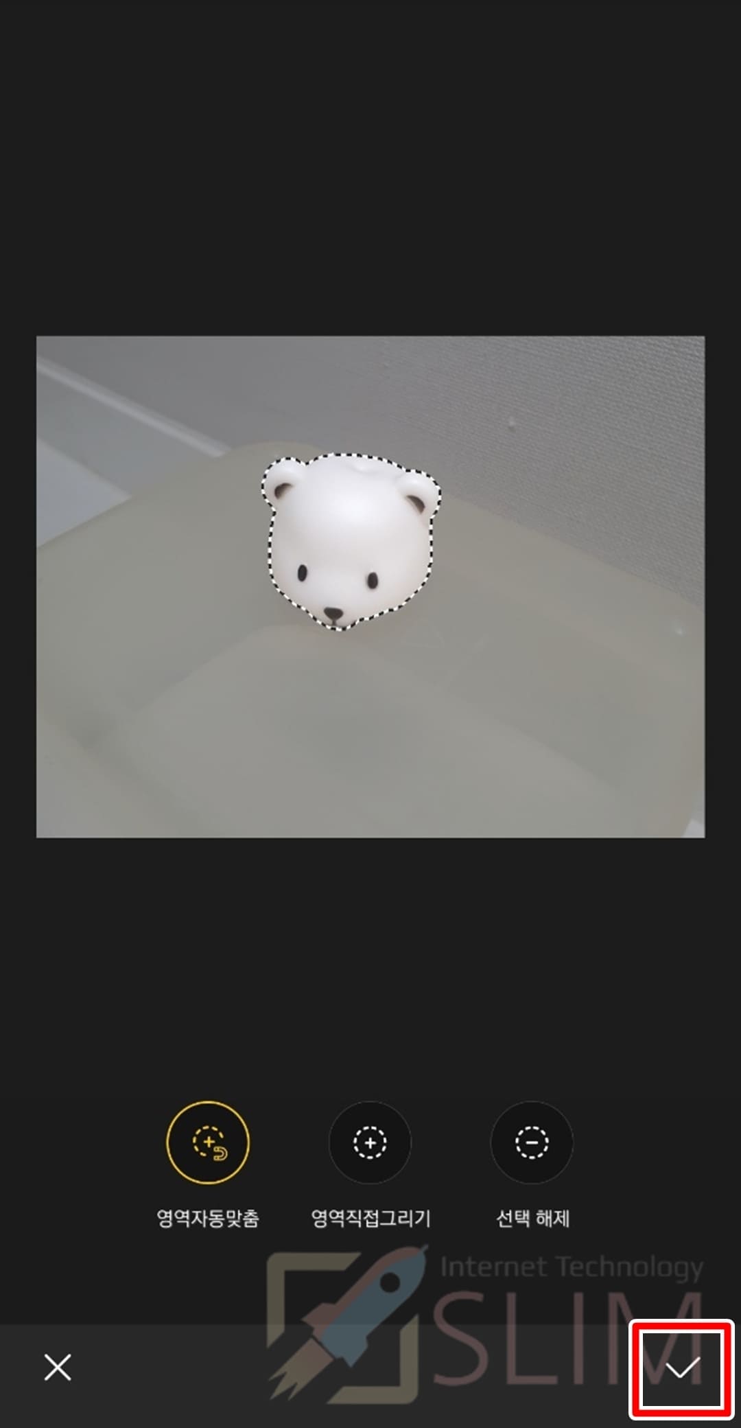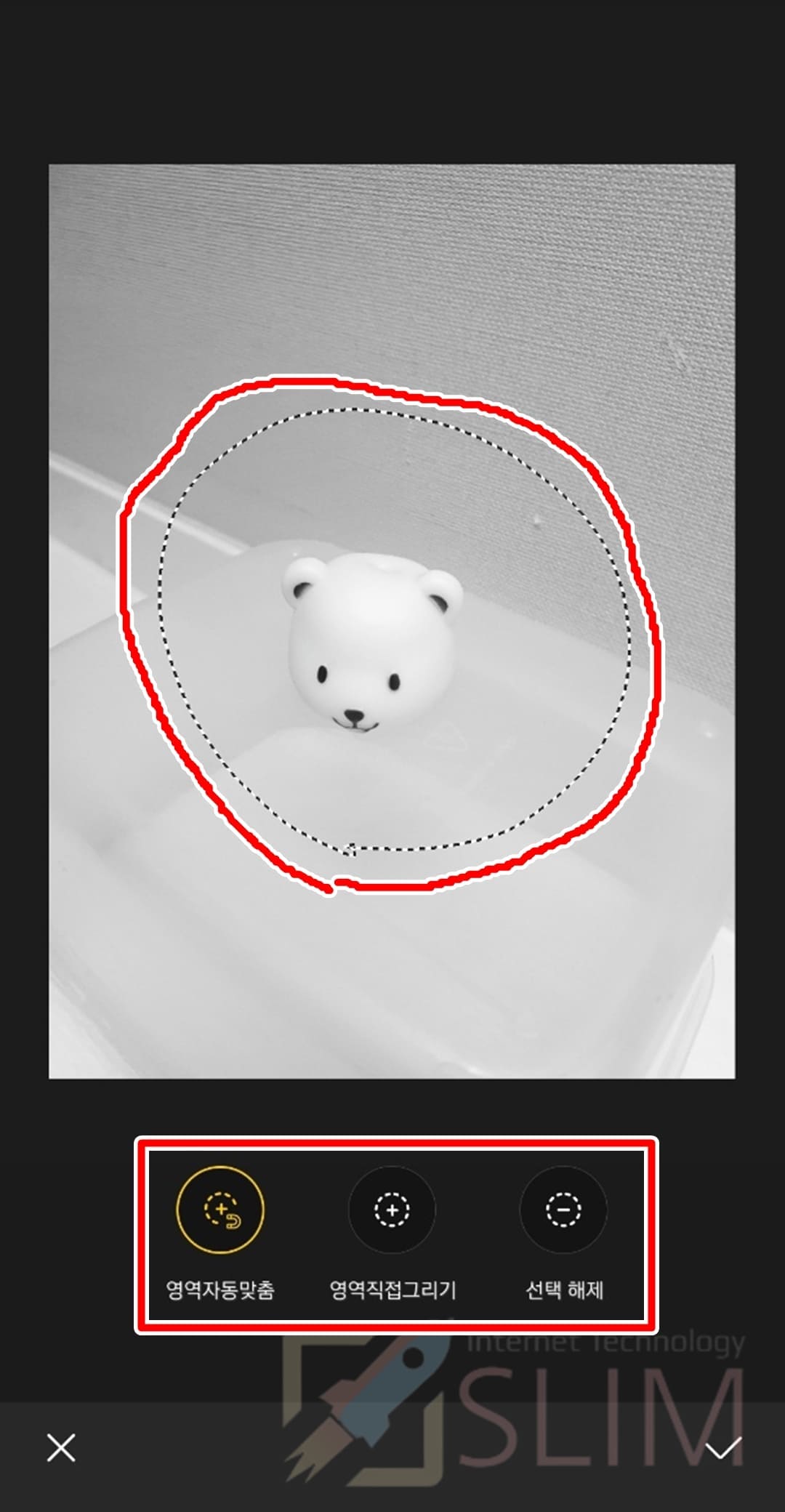 이 때 하단에서 영역자동맞춤, 영역직접그리기가 있는데요. 저는 영역자동맞춤의 사용을 추천드립니다. 영역자동맞춤을 할경우 내가 설정한 영역안에서 갤럭시가 자동으로 깔끔하게 대상물을 누끼를 따주게 되어서 고퀄리티의 합성작업에 도움을 받을 수 있기 때문입니다. 영역직접그리기시 화면상에 그려논 영역이 그대로 합성되기 때문에 결과물이 좋지 않습니다.