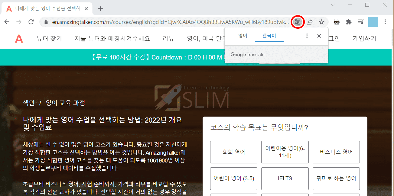 그렇다면 자동 번역이 해제된 상태에서 현재 페이지를 한국어로 번역해서 보고 싶을 때는 어떻게 해야할까요? 아래 설정법을 참고해보세요.