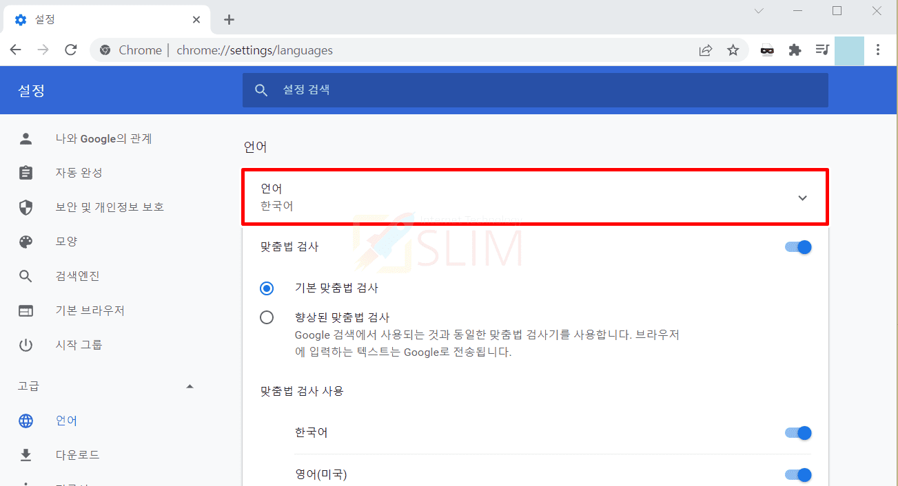 5. 언어(한국어) ▽ 버튼을 클릭합니다.
