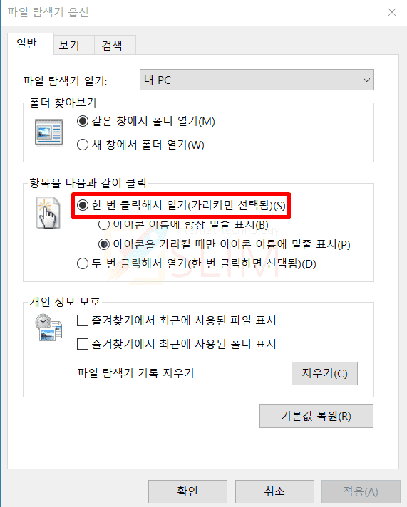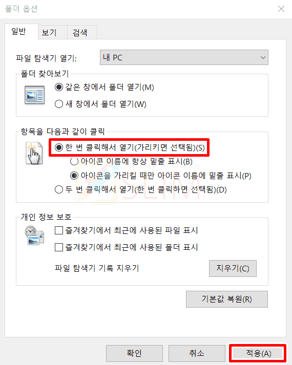 5. 일반 탭에서 한번 클릭해서 열기(가리키면 선택됨)을 체크합니다.