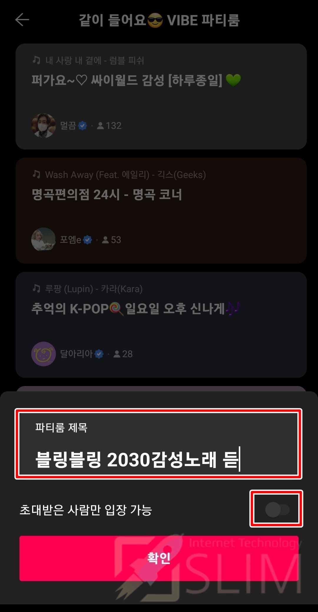 활성화하면 나의 초대링크를 눌러서만 방에 들어올 수 있게 되고 비활성화시 바이브 이용자라면 누구나 쉽게 파티룸을 확인하고 클릭해서 들어올 수 있습니다.