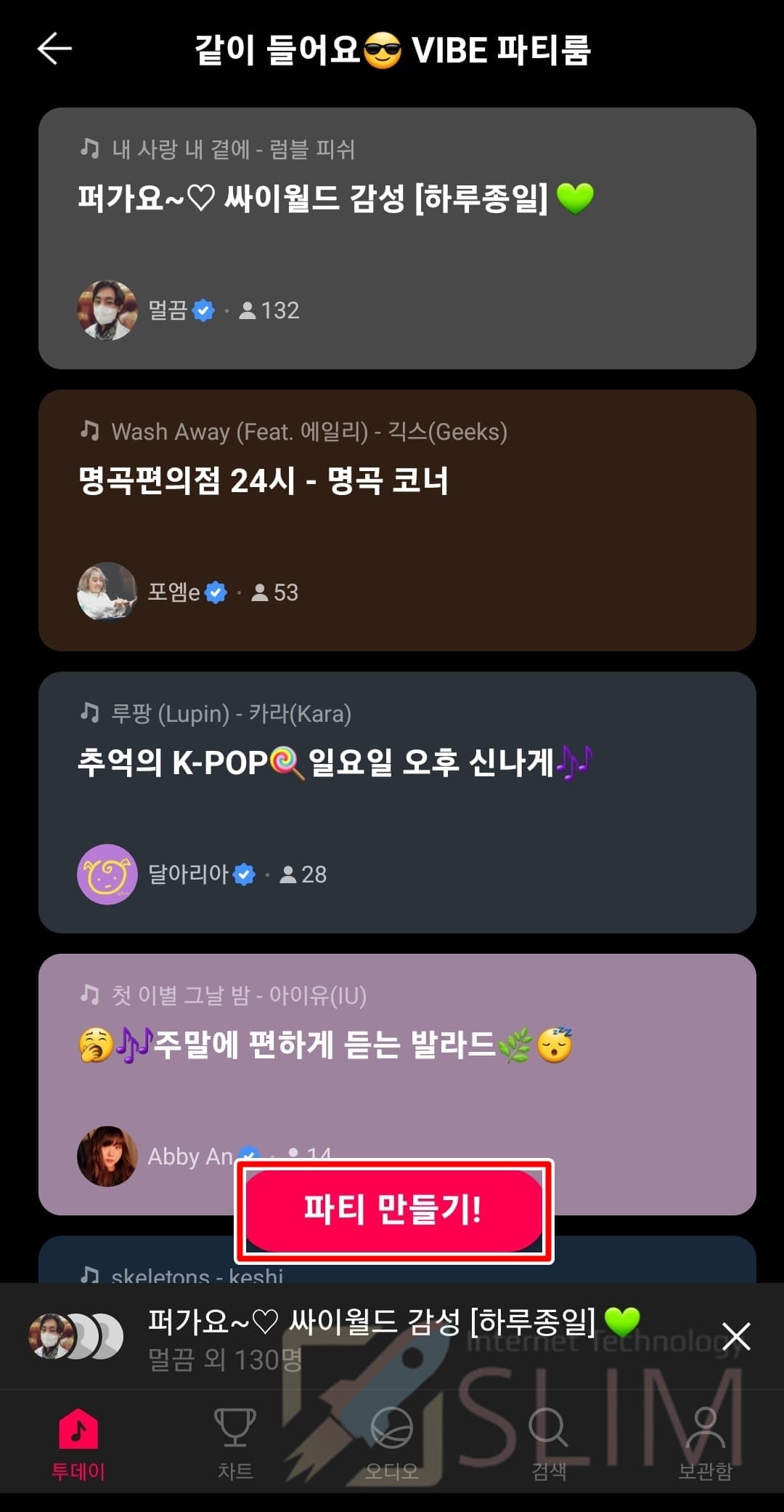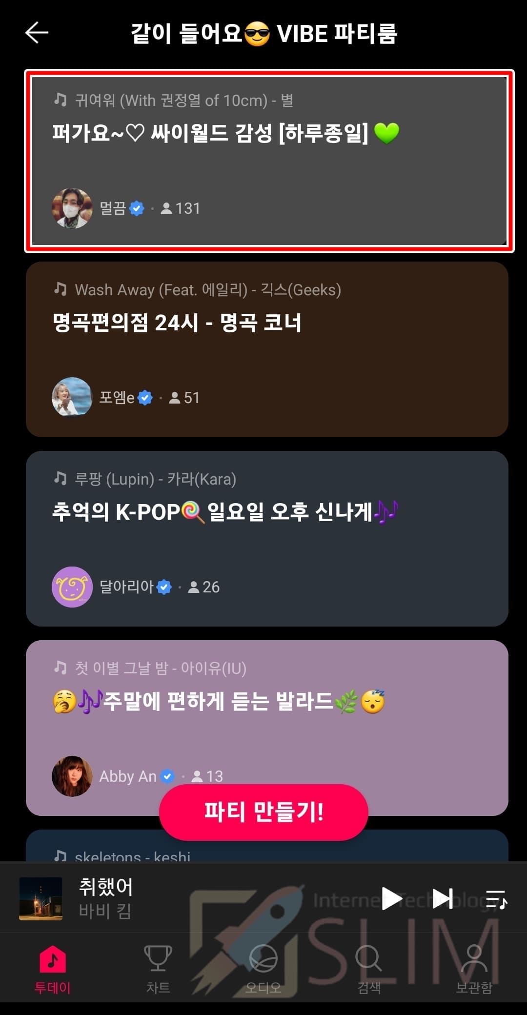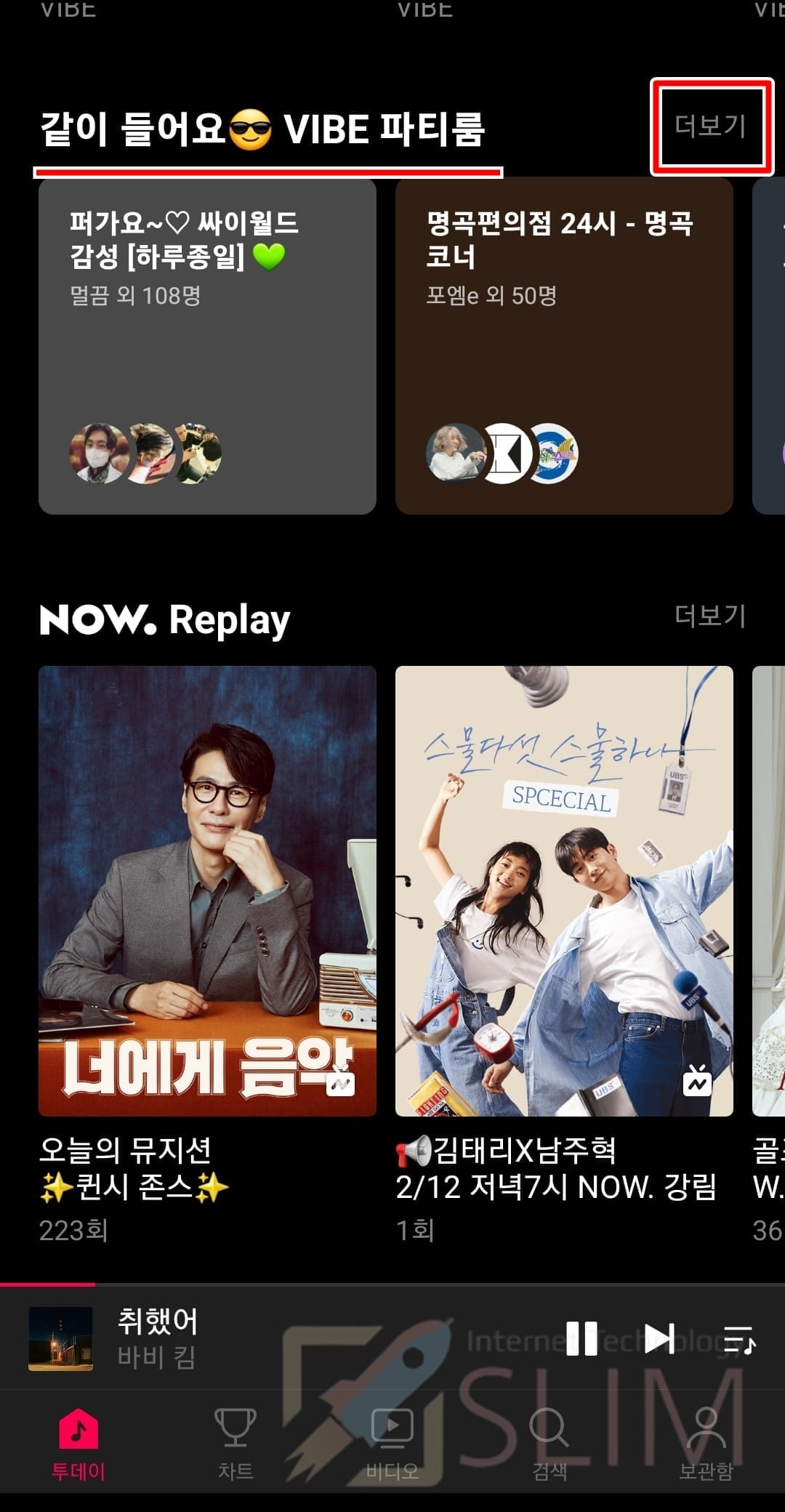 1. 바이브 앱 투데이에서 파티룸 더보기를 클릭합니다.