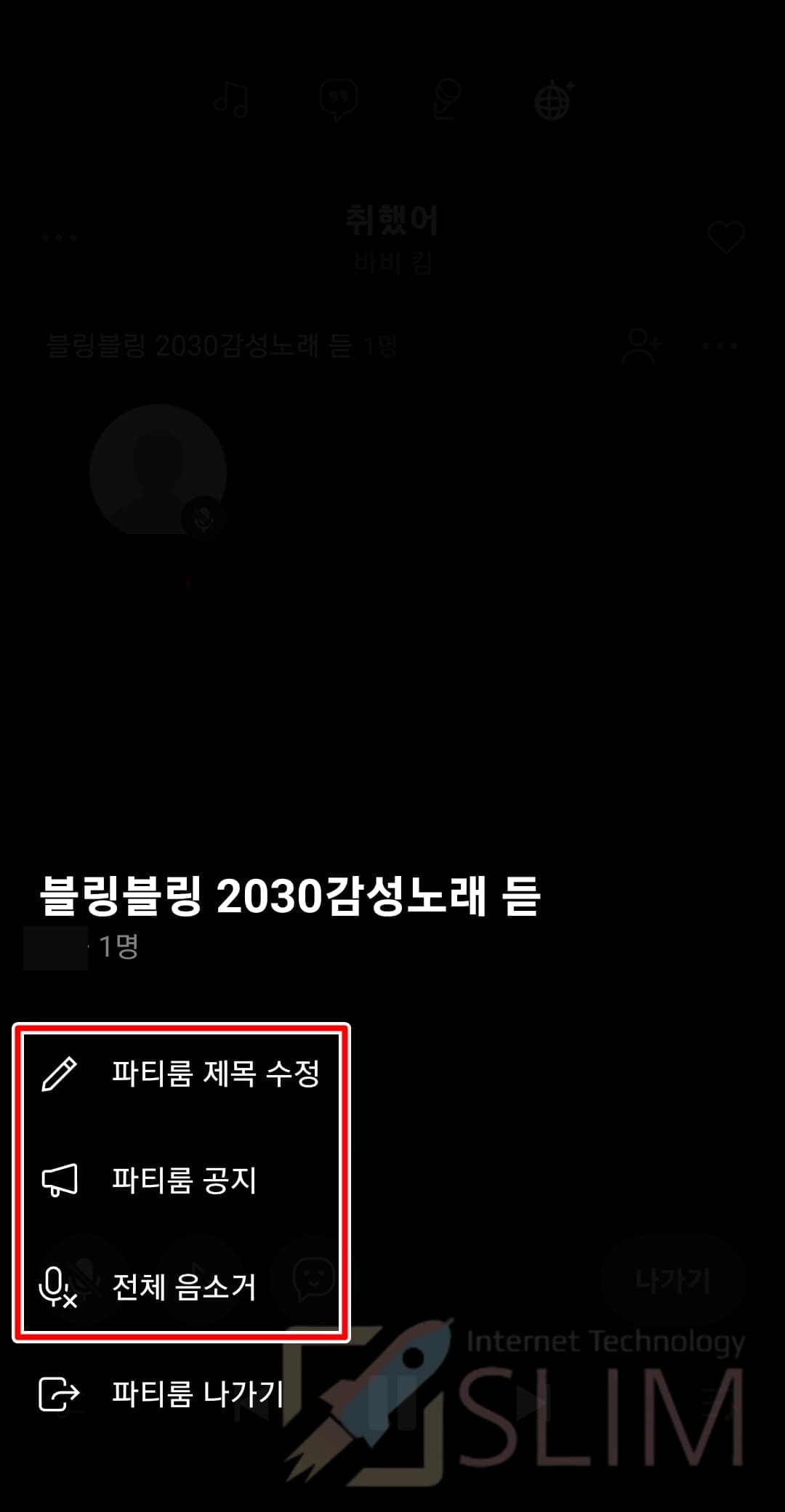 이곳에서 파티룸 제목을 수정하거나 파티룸 공지를 추가, 수정할 수 있습니다. 또 전체 음소거를 해서 참여자들의 마이크를 음소거시키는 것도 가능합니다.