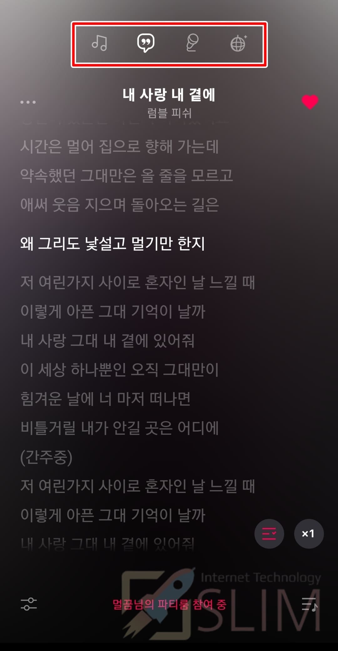 바이브에서 노래가 재생할 땐 상단에 보여지는 메뉴 버튼들이 있습니다. 이곳에서 두번째 말풍선 모양의 메뉴 버튼을 눌러보시면 현재 파티룸에서 재생중인 노래의 가사를 확인할 수 있습니다. 참고로 바이브 노래방 기능은 파티룸에선 제공되지 않으니 참고하시길 바랍니다.