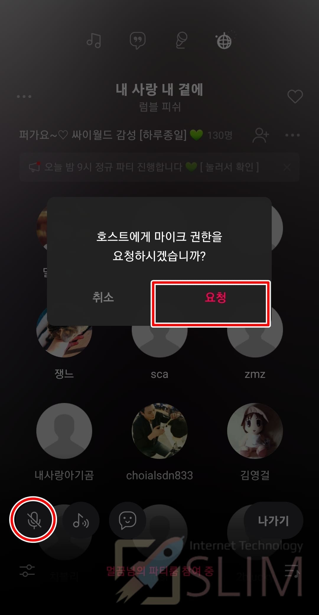 파티룸 좌측 하단을 보시면 슬래시가 쳐진 마이크버튼을 보실 수 있습니다. 처음 파티룸을 입장하면 이렇게 기본 음소거 상태로 참여됩니다. 마이크를 열어서 다른 참여자들과 음성대화를 하고 싶으시다면 마이크버튼을 클릭해주세요. 이후에 호스트에게 마이크 권한을 요청하시겠습니까? 팝업에서 요청을 눌러주시면 됩니다. 이후에 호스트가 확인한 후 권한을 허용해주면 파티룸 참여자들과 노래를 들으면서 음성대화를 나눌 수 있습니다.
