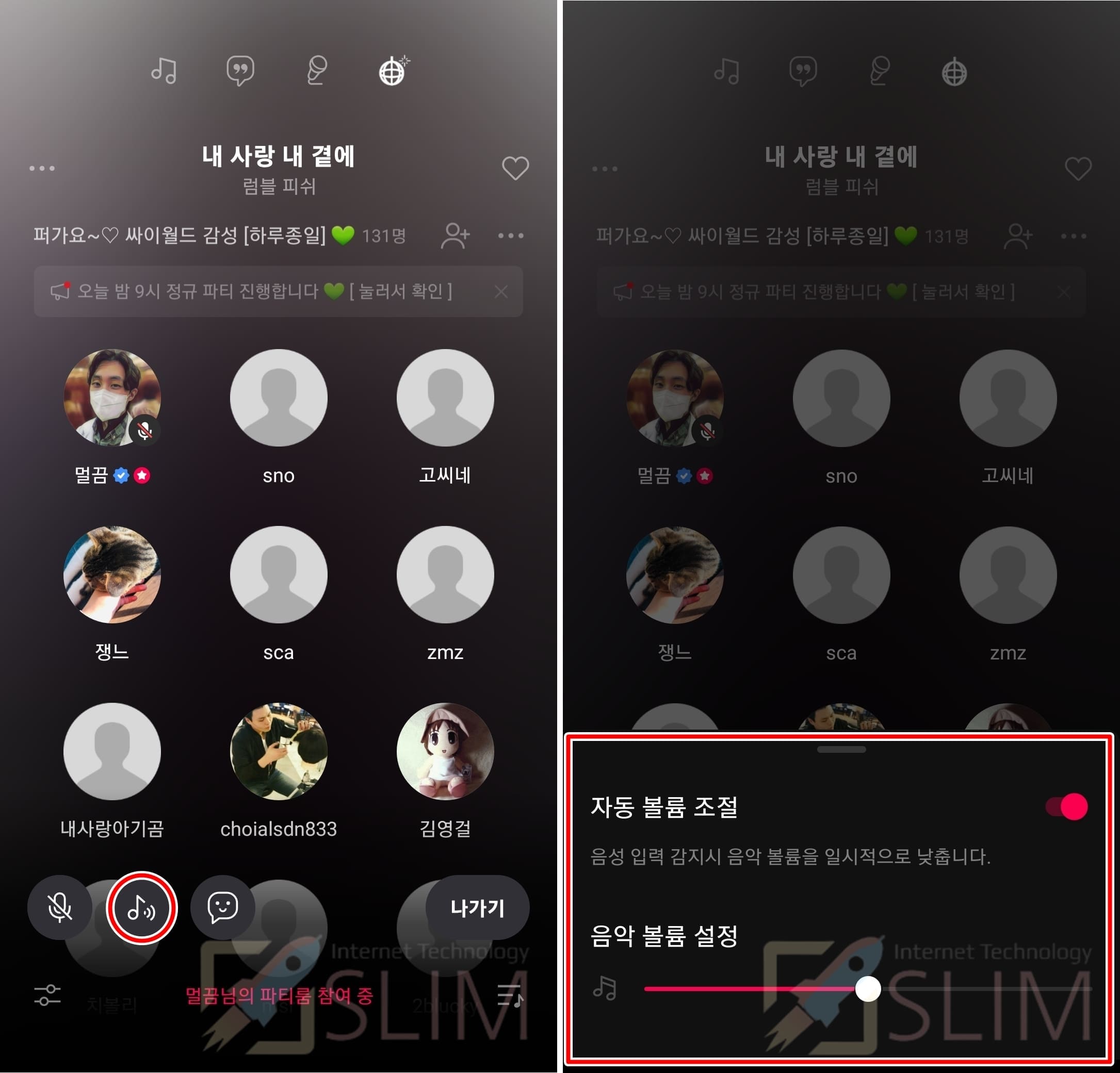 파티룸 하단 메뉴에서 음표모양의 버튼을 클릭합니다. 그러면 자동 볼륨 조절로 음성 입력 감지시 음악 볼륨을 일시적으로 낮출 수 있으며 현재 파티룸에서 재생되는 음악 볼륨의 크기를 조절할 수도 있습니다.