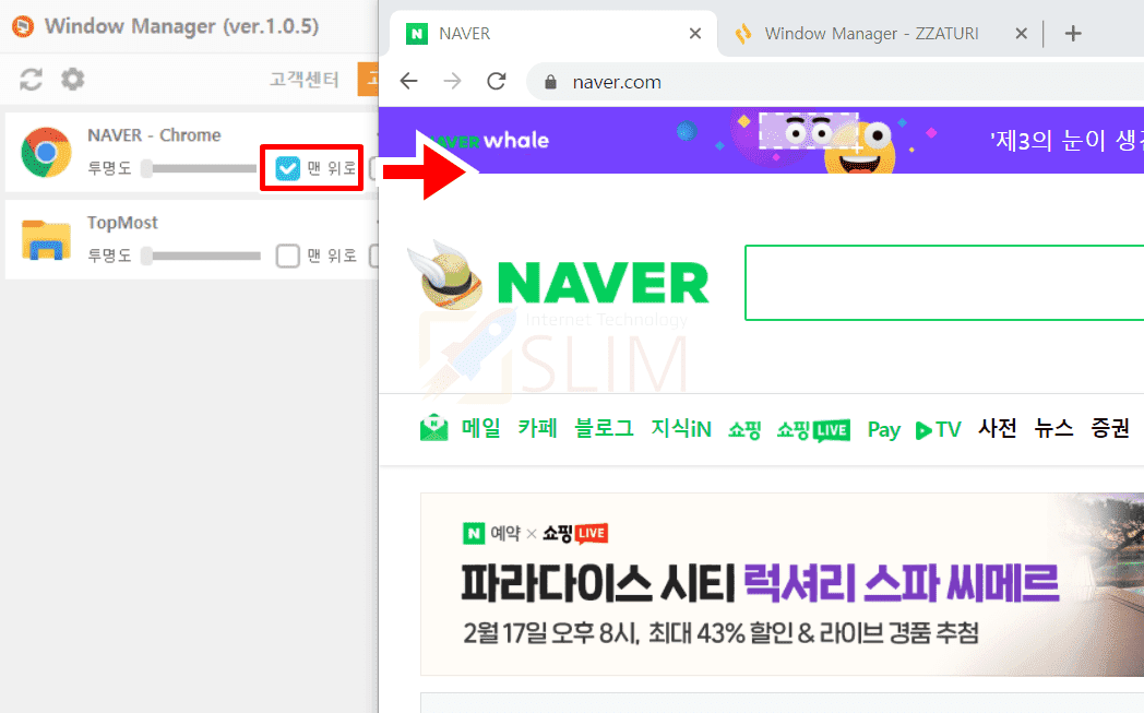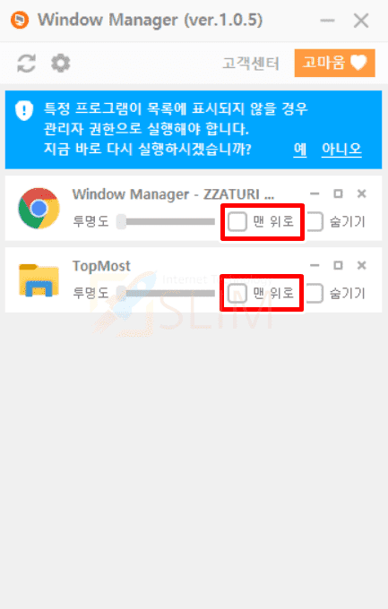 제가 가장 추천드리고 싶은 윈도우창을 항상 위에 고정시켜주는 프로그램은 자투리의 윈도우 매니저입니다. 한국어로 되어있고 설정 기능들을 간편하게 체크 클릭으로 사용할 수 있기에 처음 이용하시는 분도 쉽고 편리하게 사용할 수 있습니다.