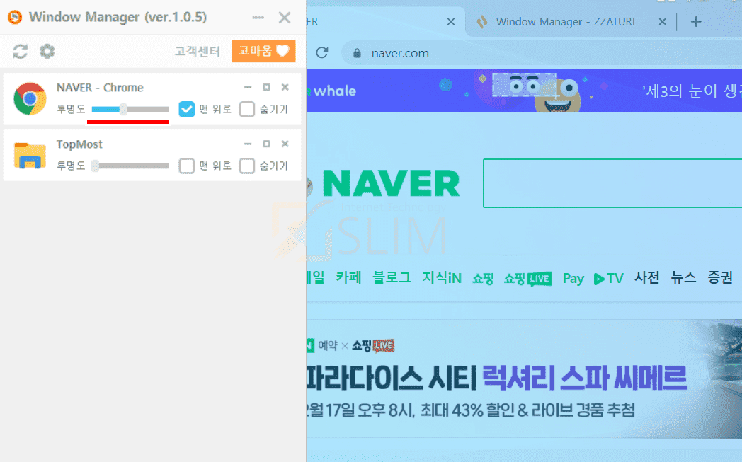 함께 사용할 수 있는 유용한 기능중에서는 투명도가 있습니다. 컴퓨터에서 특정한 윈도우창을 항상 위로 고정하면 간혹 뒤에 보여지는 내용들이 필요할 때가 있는데 이럴땐 투명도 바를 조절하시면 됩니다. 우측으로 조절바를 밀수록 더 투명해지며 뒤의 배경이 보여집니다.