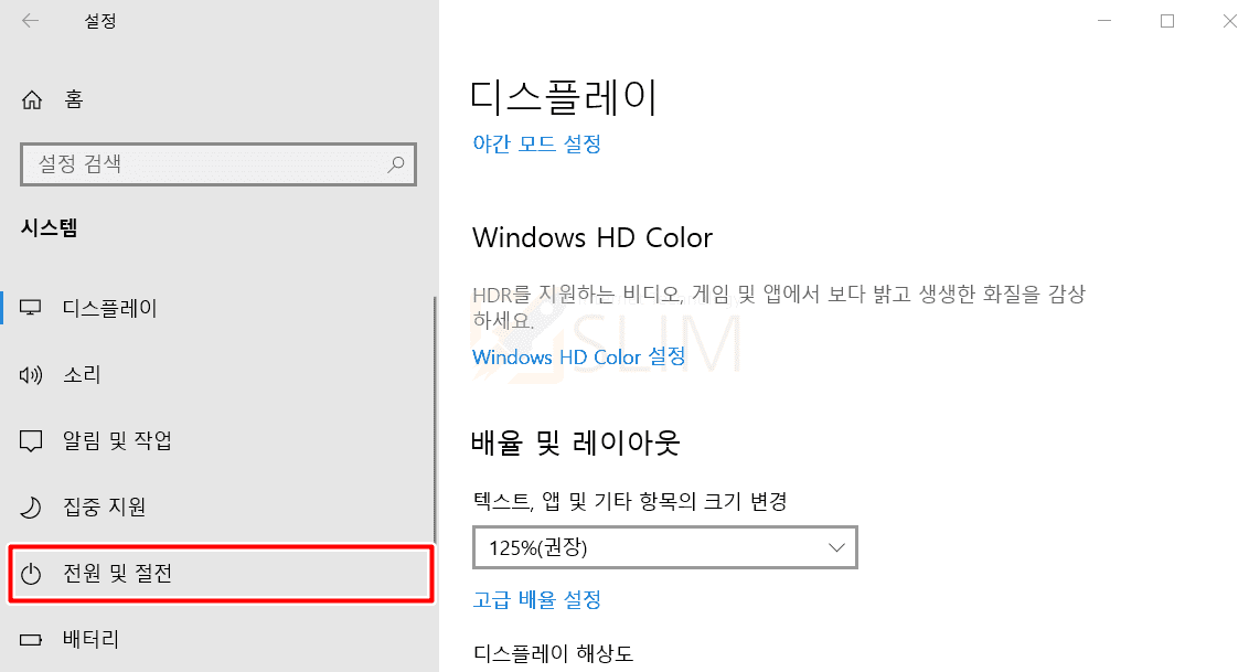 노트북의 경우에는 배터리 사용과 전원 사용에 따라서 전원버튼을 눌렀을 때 다르게 작동하도록 설정하는 것이 가능합니다. 또 이곳에서 절전 단추나 덮개를 닫을 때의 설정도 가능하니 나의 사용습관에 맞춰서 기능을 변경해보세요.
