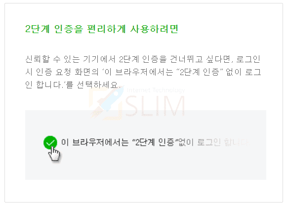 네이버 2단계 인증을 편리하게 사용하려면? 신뢰할 수 있는 기기에서 2단계 인증을 건너뛰고 싶다면, 로그인시 인증 요청 화면의 '이 브라우저에서는 "2단계 인증"없이 로그인 합니다.'를 선택하셔야 합니다. 이렇게 설정 후 사용해야지만 불편함없이 네이버 2단계 인증을 사용할 수 있어서 강력히 추천드립니다.