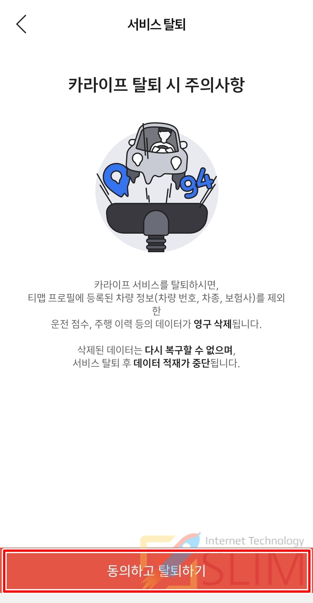 카라이프 서비스를 탈퇴하시면 티맵 프로필에 등록된 차량 정보(차령 번호, 차종, 보험사)를 제외한 운전 점수, 주행 이력 등의 데이터가 영구 삭제됩니다. 삭제된 데이터는 다시 복구할 수 없으며, 서비스 탈퇴 후 데이터 적재가 중단됩니다.
