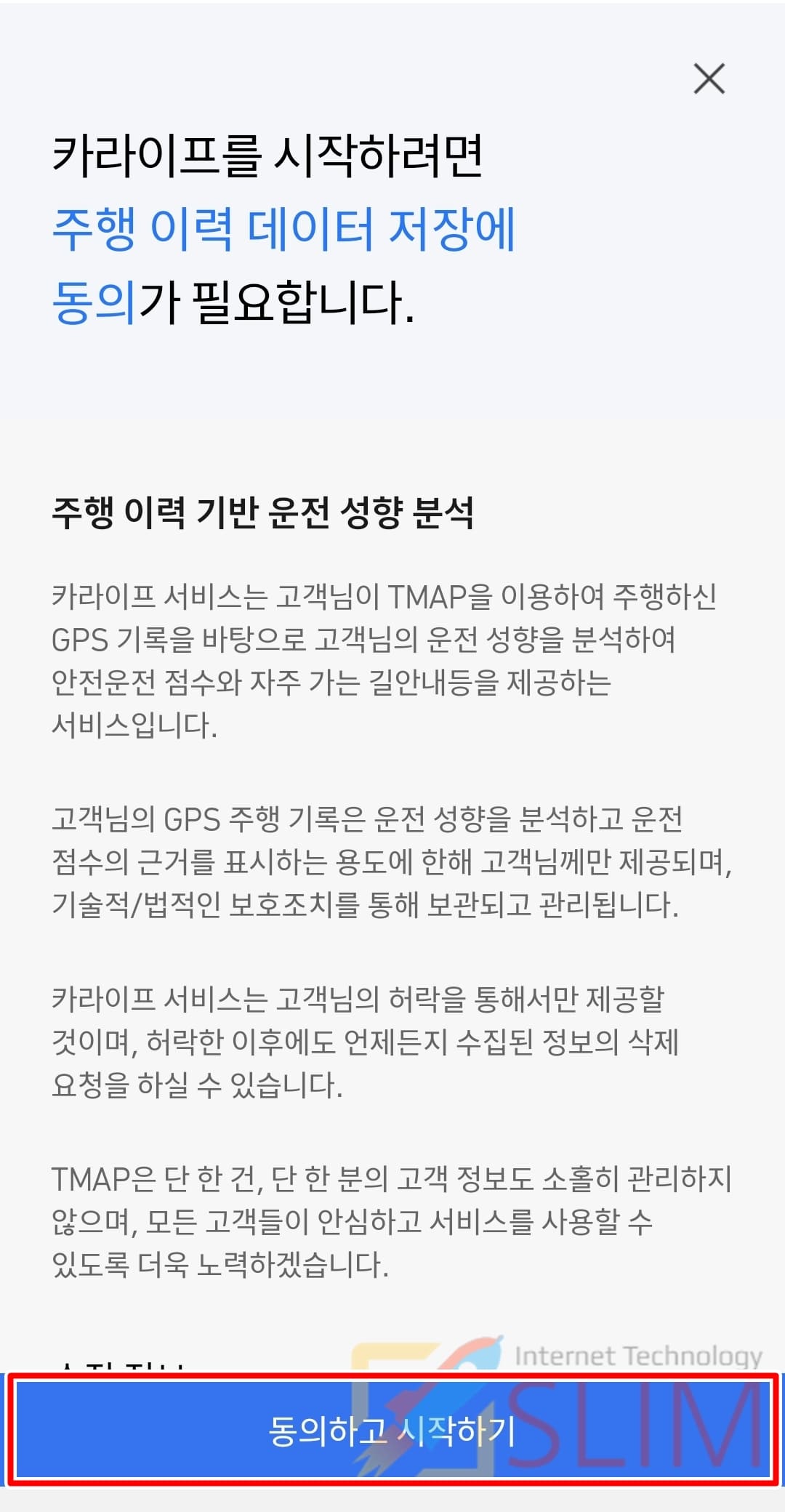 8. 주행 이력 데이터 저장에 동의하고 시작합니다.