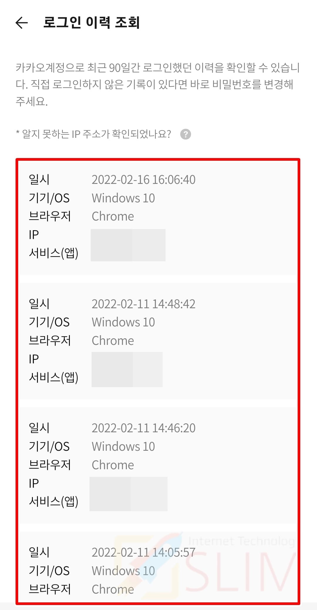 8. 카카오톡 로그인 기록을 확인합니다.