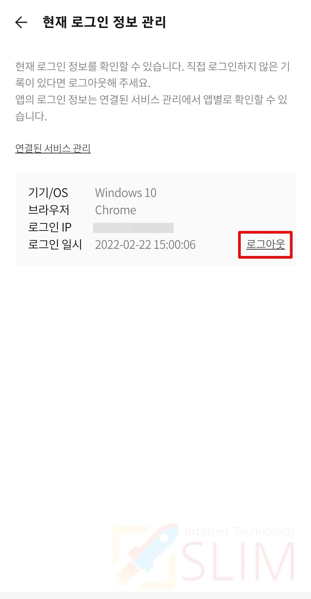 실시간으로 나의 카카오계정으로 로그인해서 사용중인 정보를 볼 수 있는데요. 정보로는 기기/브라우저/IP/로그인 일시가 있습니다. 만약 본인이 아니라면 즉시 [로그아웃]을 눌러서 꺼주시길 바랍니다.