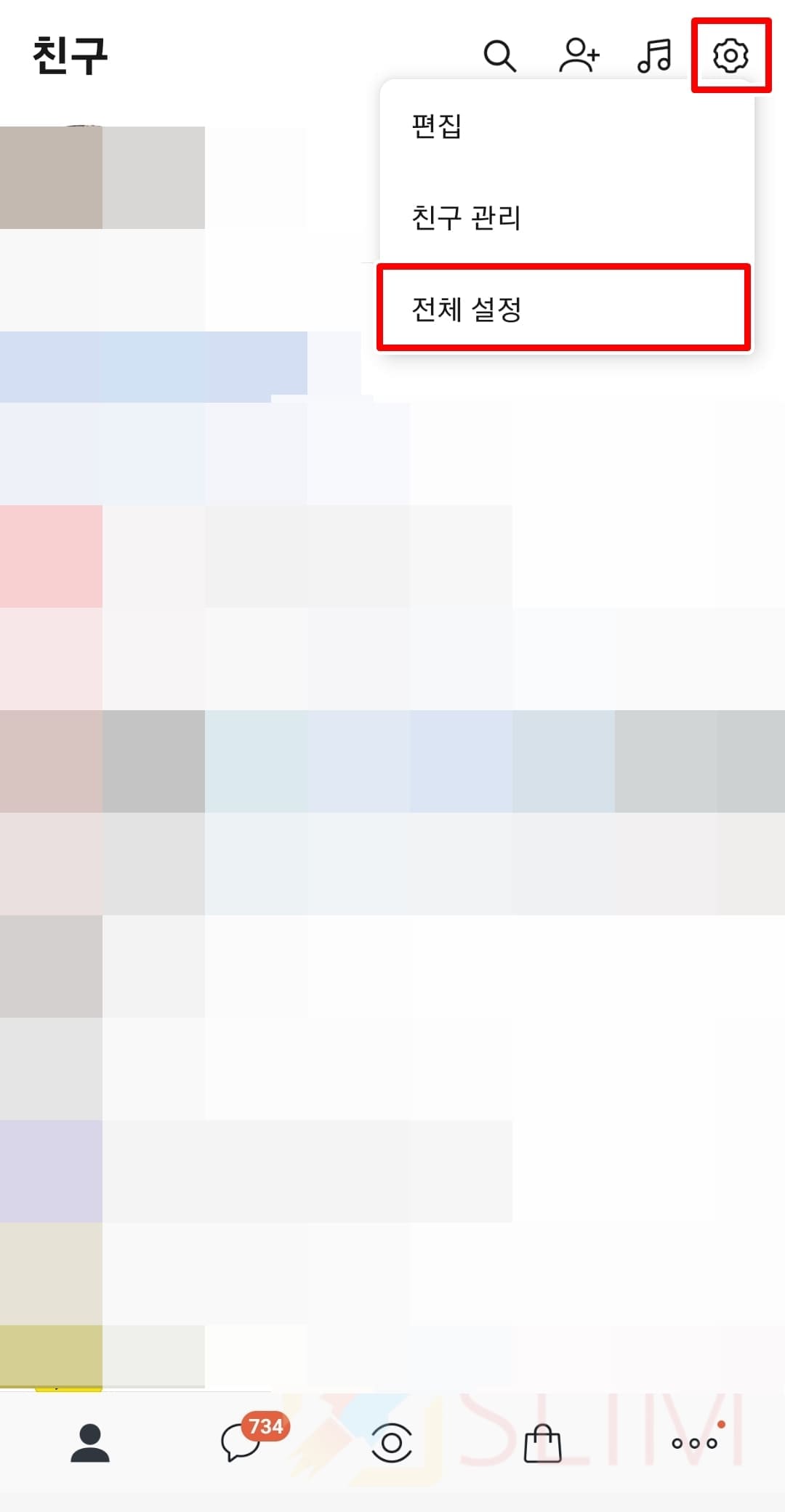 1. 카카오톡 앱에서 톱니바퀴 설정 버튼을 클릭합니다.