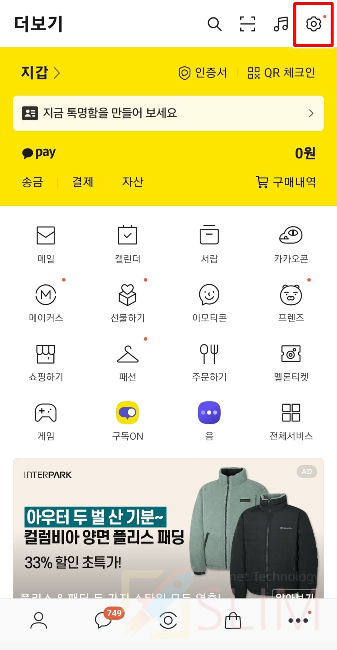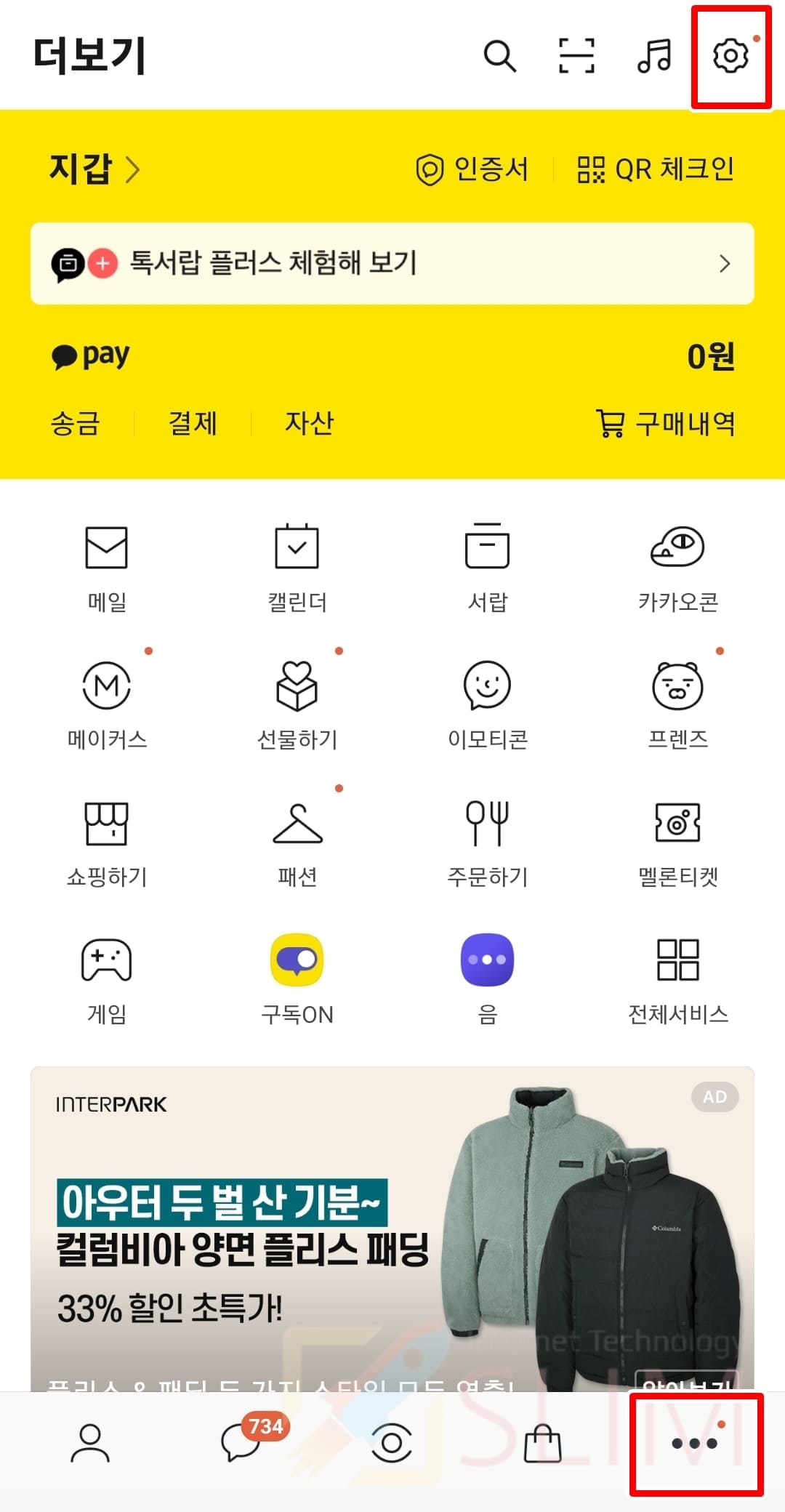 1. 카카오톡 앱에서 더보기 > 톱니바퀴 버튼을 클릭합니다.