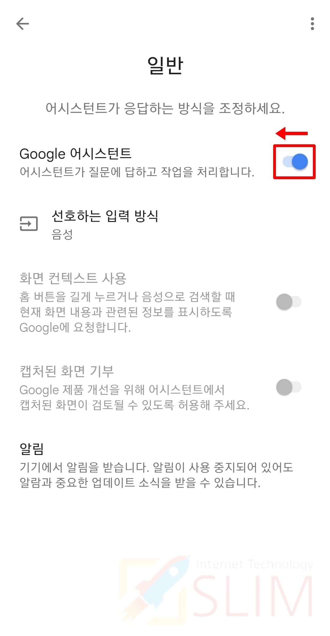 7. Google 어시스턴트 우측 버튼을 눌러서 비활성화합니다.