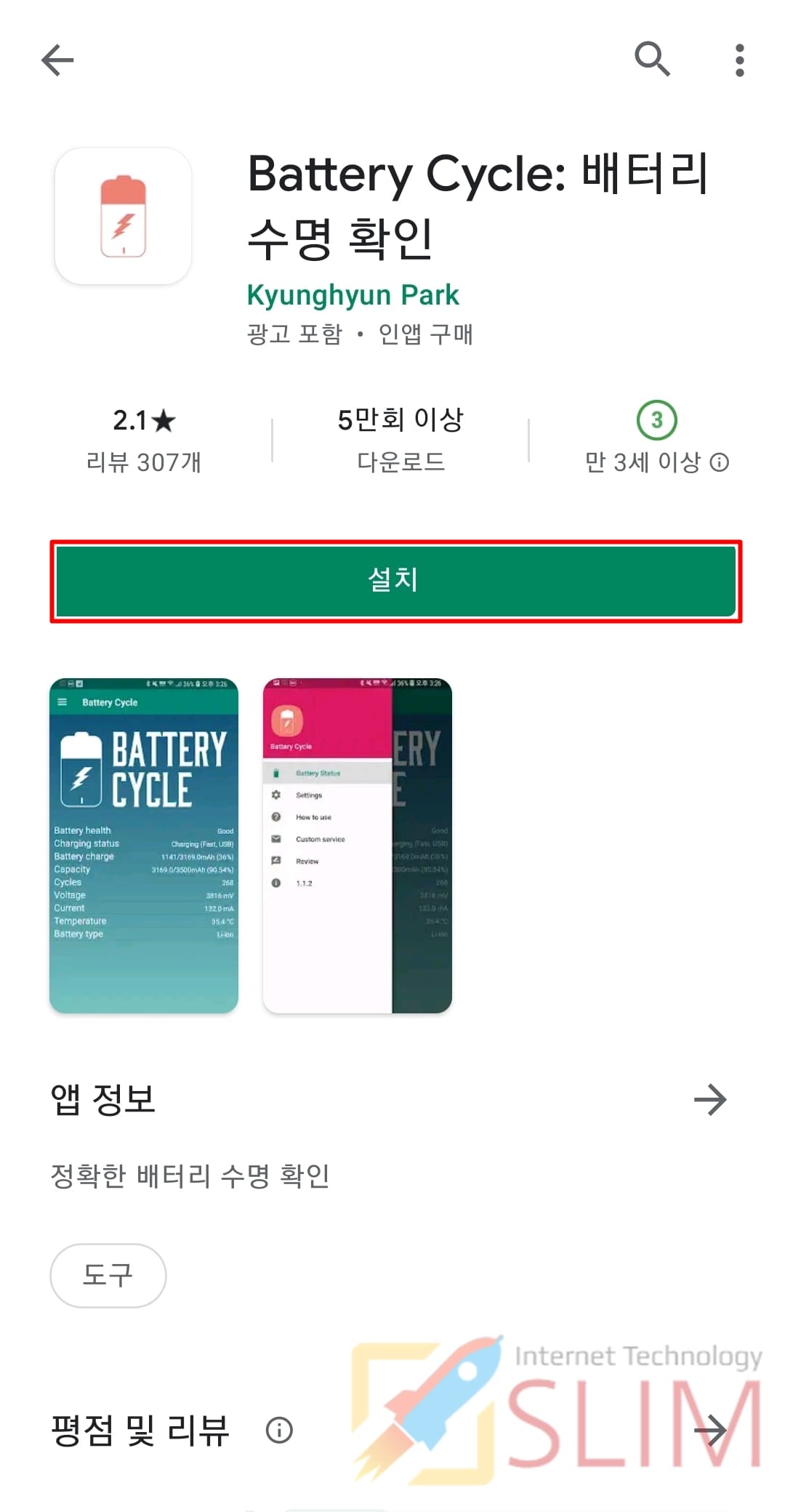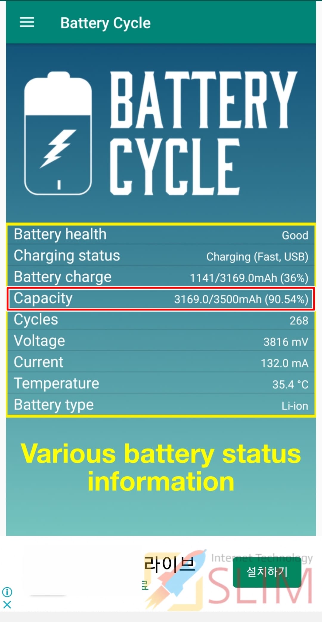 ▲ 제가 첫번째로 사용해본 앱은 Battery Cycle: 배터리 수명 확인입니다. 구글 플레이 스토어에서 "배터리 수명 확인"을 검색하셔서 나오는 앱들 중 아무거나 설치하셔도 무방합니다.