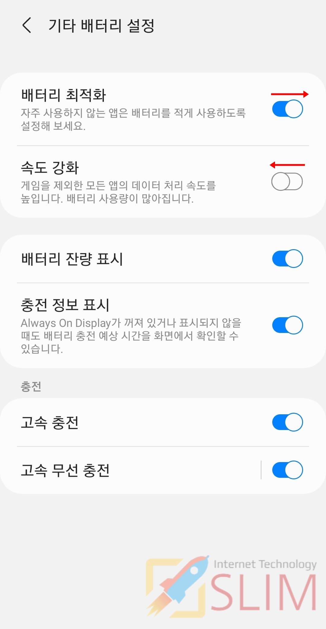 5. 배터리 최적화를 활성화해주고 속도 강화는 비활성화합니다.