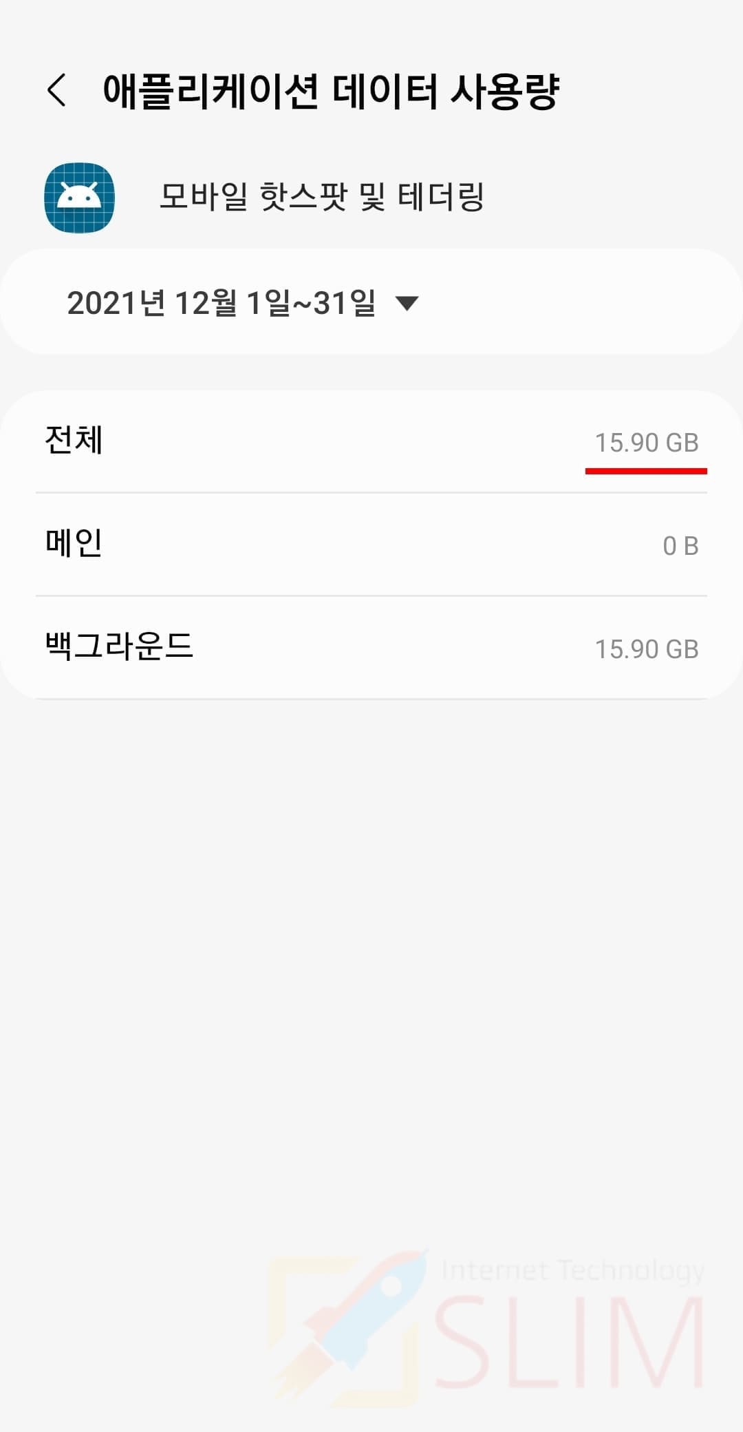 핫스팟 데이터의 사용량은 전체 부분을 확인하시면 됩니다. 저의 경우 21/12월 한달간 핫스팟으로 15.90GB를 사용했었던 것을 볼 수 있었네요. 이렇게 조회하셔서 나의 사용량을 파악하고 관리해주시면 되겠습니다.