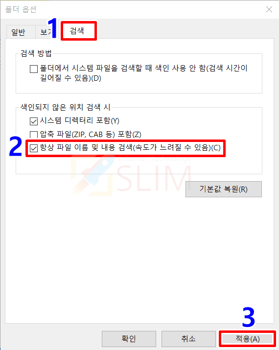 6. 항상 파일 이름 및 내용 검색(속도가 느려질 수 있음)을 체크합니다.