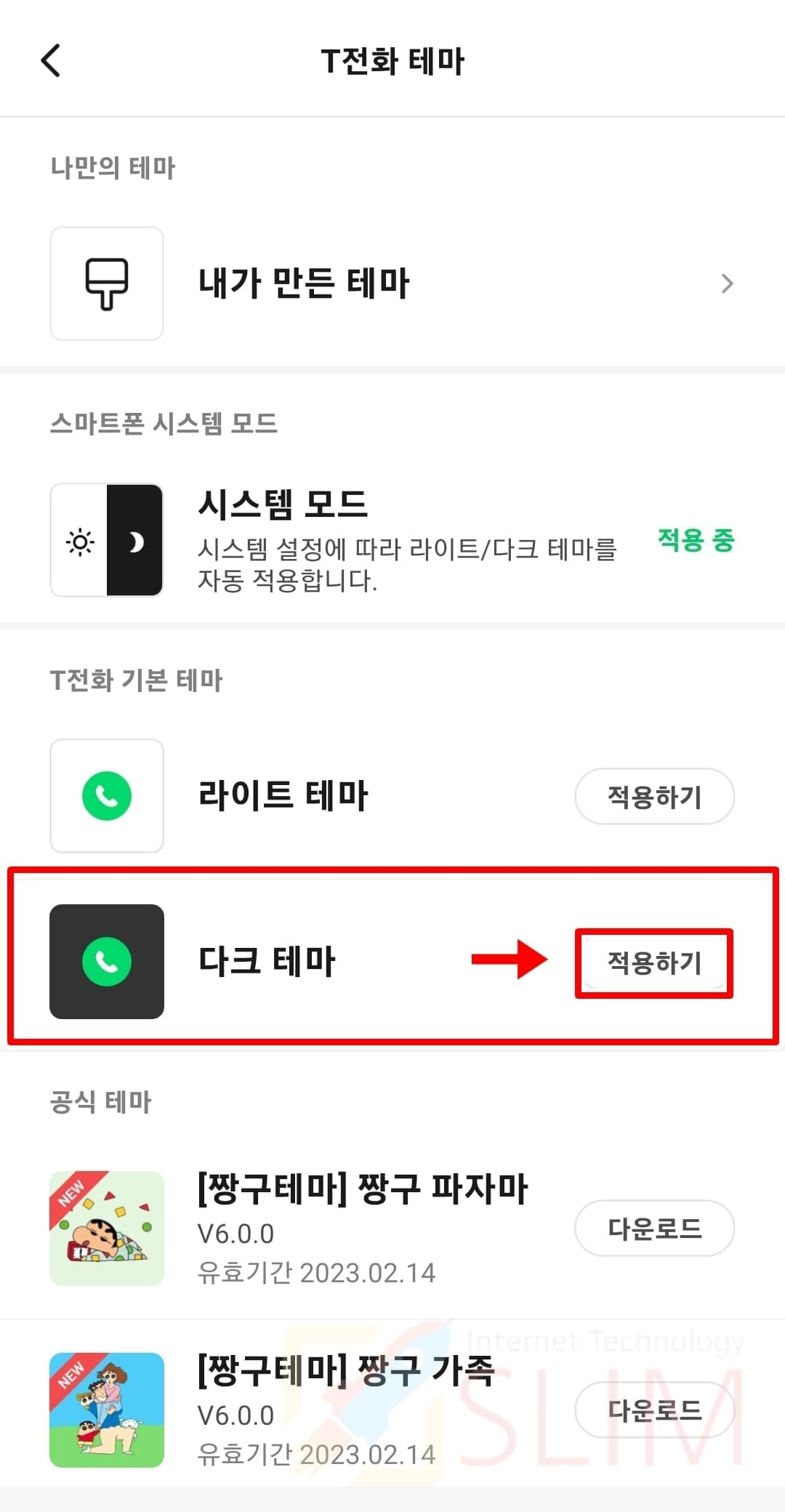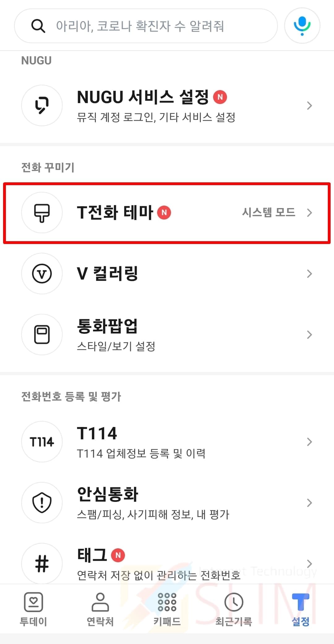 3. T전화 앱 > 설정 > T전화 테마에서 시스템 모드를 적용합니다.