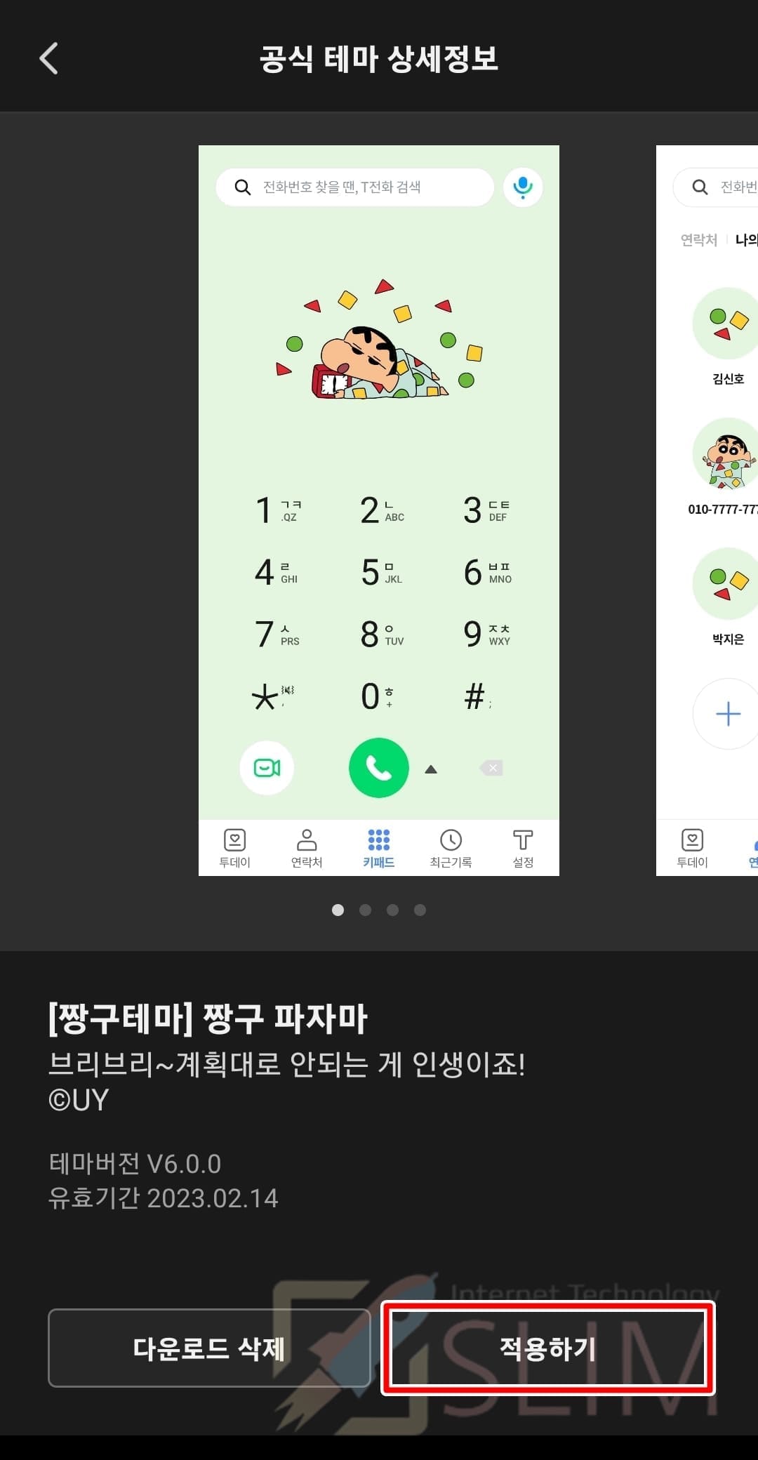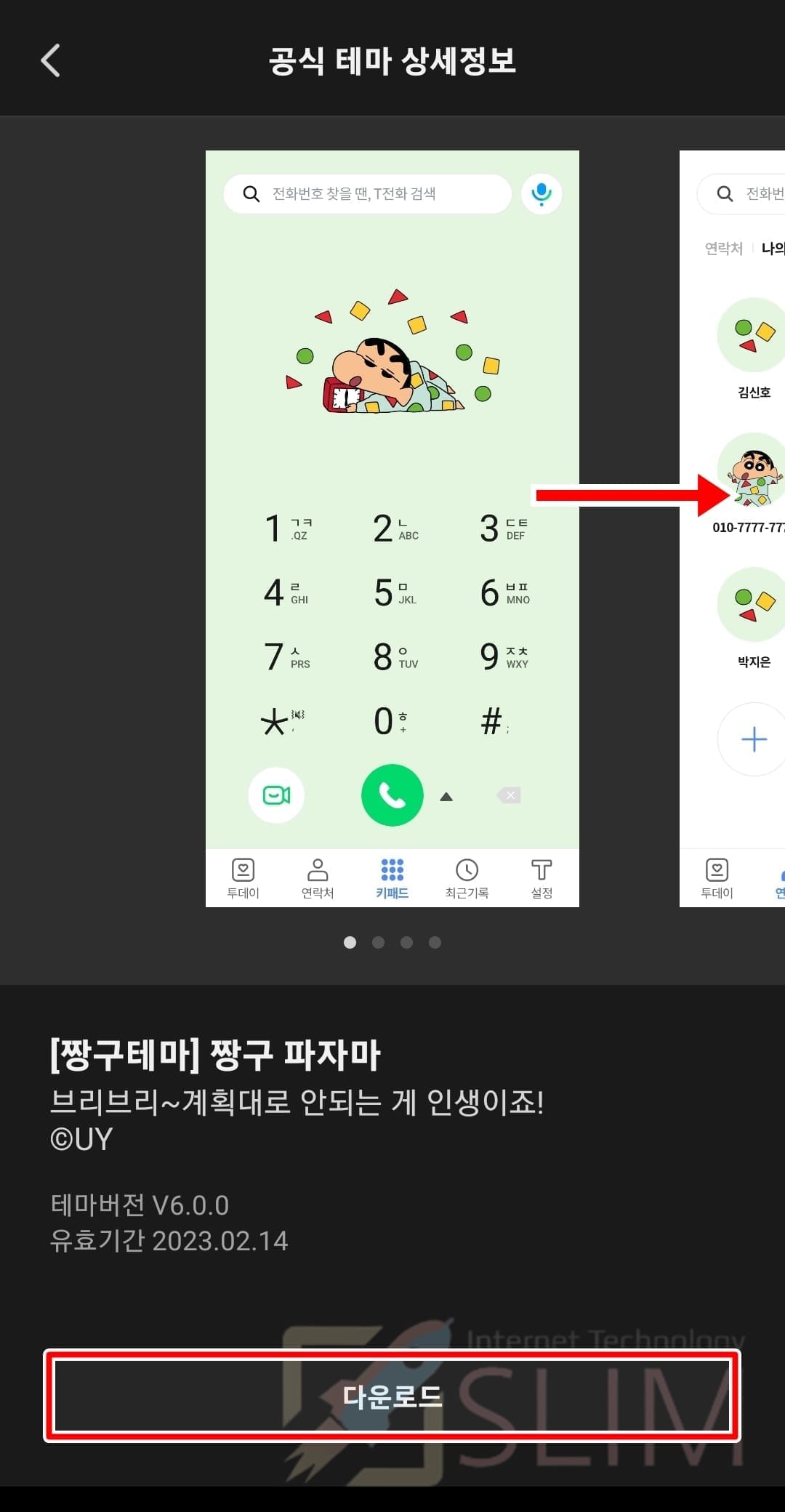 여담으로 T전화 다크모드 설정을 알아보시는 여러분들께 한가지 좋은 팁을 소개드리도록 하겠습니다. 아무래도 다크모드를 디자인이 좋아서 이용하시는 분들의 경우 굉장히 유용한 팁이 될 것입니다. T전화에서는 공식테마로 귀엽고 재미있는 인기 캐릭터의 테마를 무료로 제공하고 있는데요. 그래서 다른 테마를 확인해보시고 원클릭으로 쉽게 테마를 바꿔줄 수 있습니다.