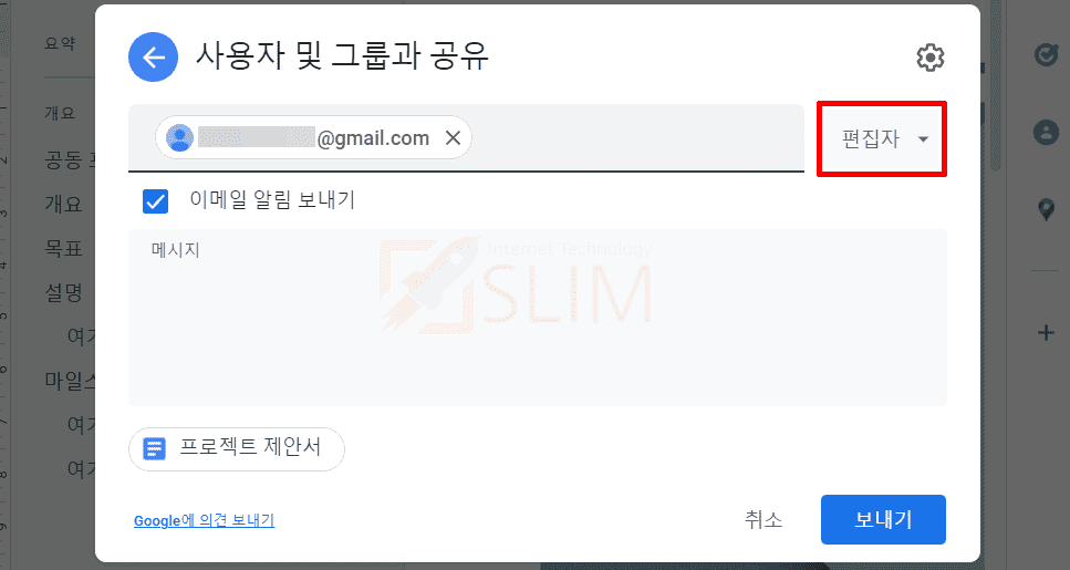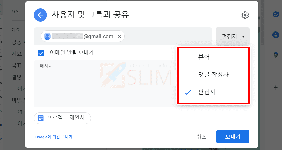 저는 공동작업을 위해서 구글 문서를 공유하는 것이기에 편집자를 선택해주었습니다.