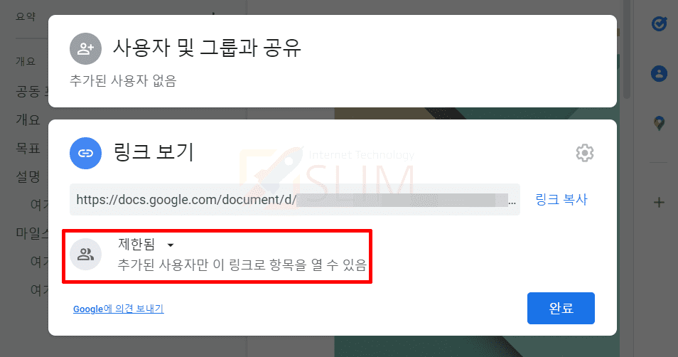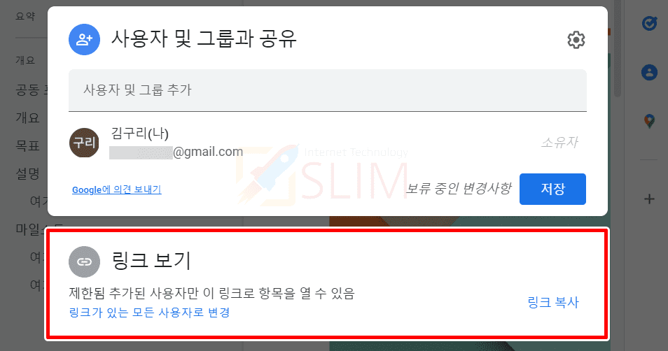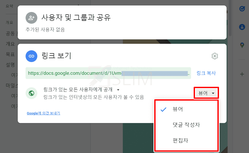 위에서 소개된 이메일 주소로 구글 문서 공유하는 과정과 일치합니다. 다만 사용자 및 그룹과 공유가 아닌 아래 링크보기 기능을 눌러서 공유해주시면 되겠습니다.