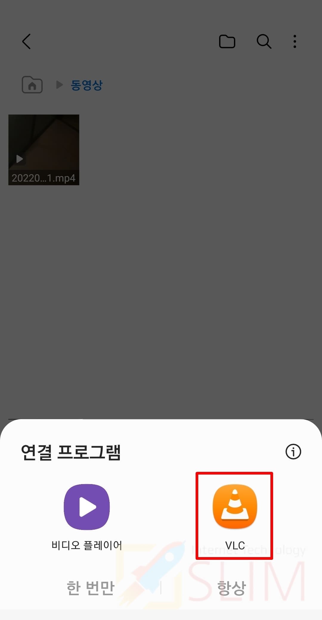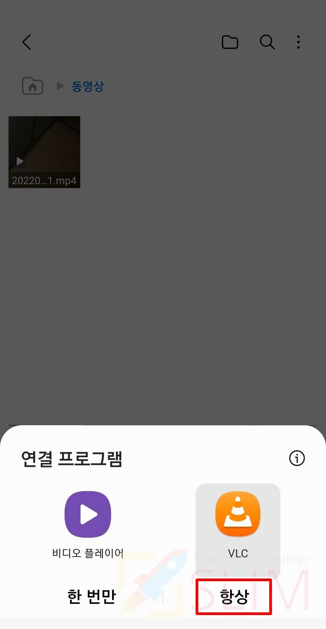 이제 갤럭시 기본 동영상 플레이어 앱의 설정이 초기화되면서 동영상 파일 클릭시 연결할 동영상 플레이어 앱을 별도로 지정해서 실행할 수 있습니다. 이렇게 실행시 한번만, 항상 연결할지를 선택하여 내가 선택한 플레이어 앱을 기본 앱으로 변경도 가능합니다.