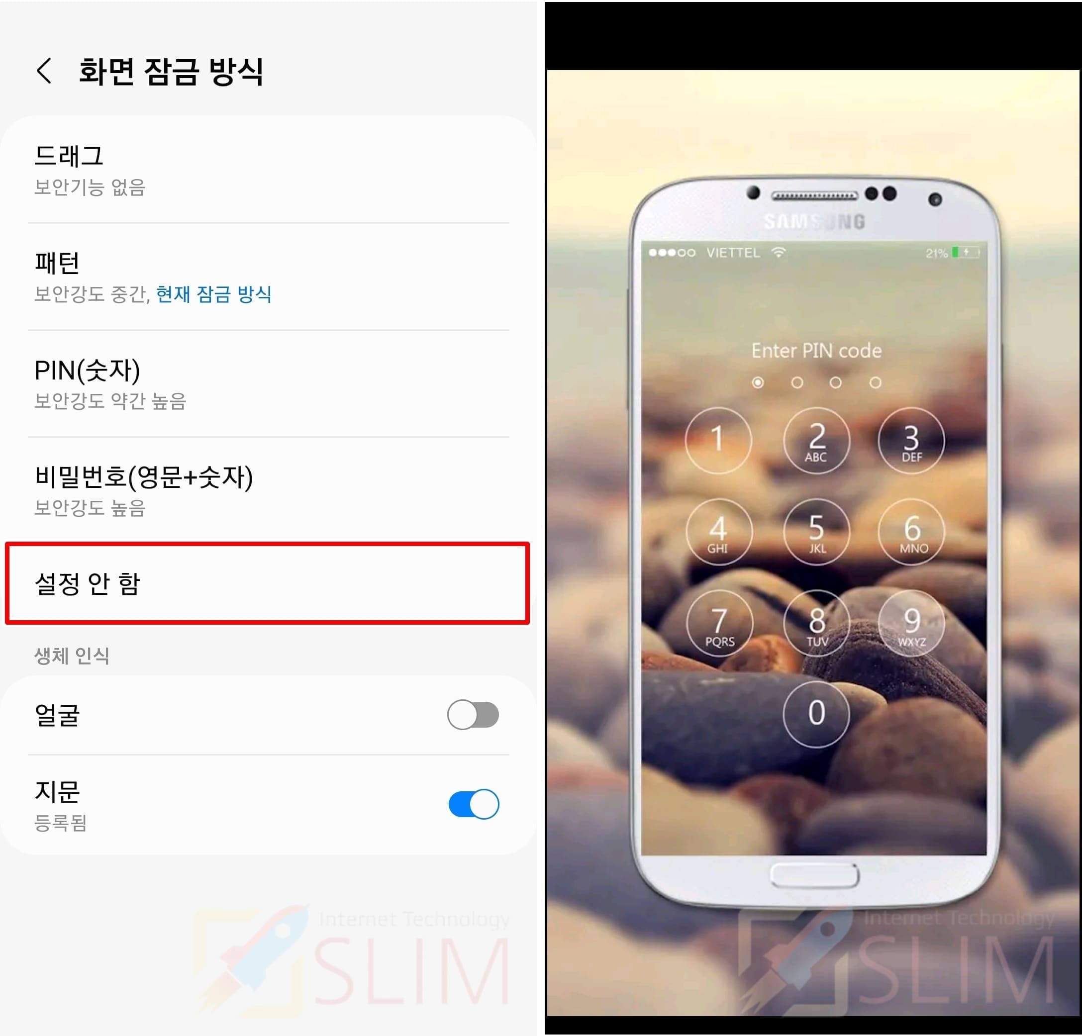 갤럭시 잠금화면 없애기: 설정 앱 > 잠금화면 > 화면잠금방식 > 설정 안함 클릭
