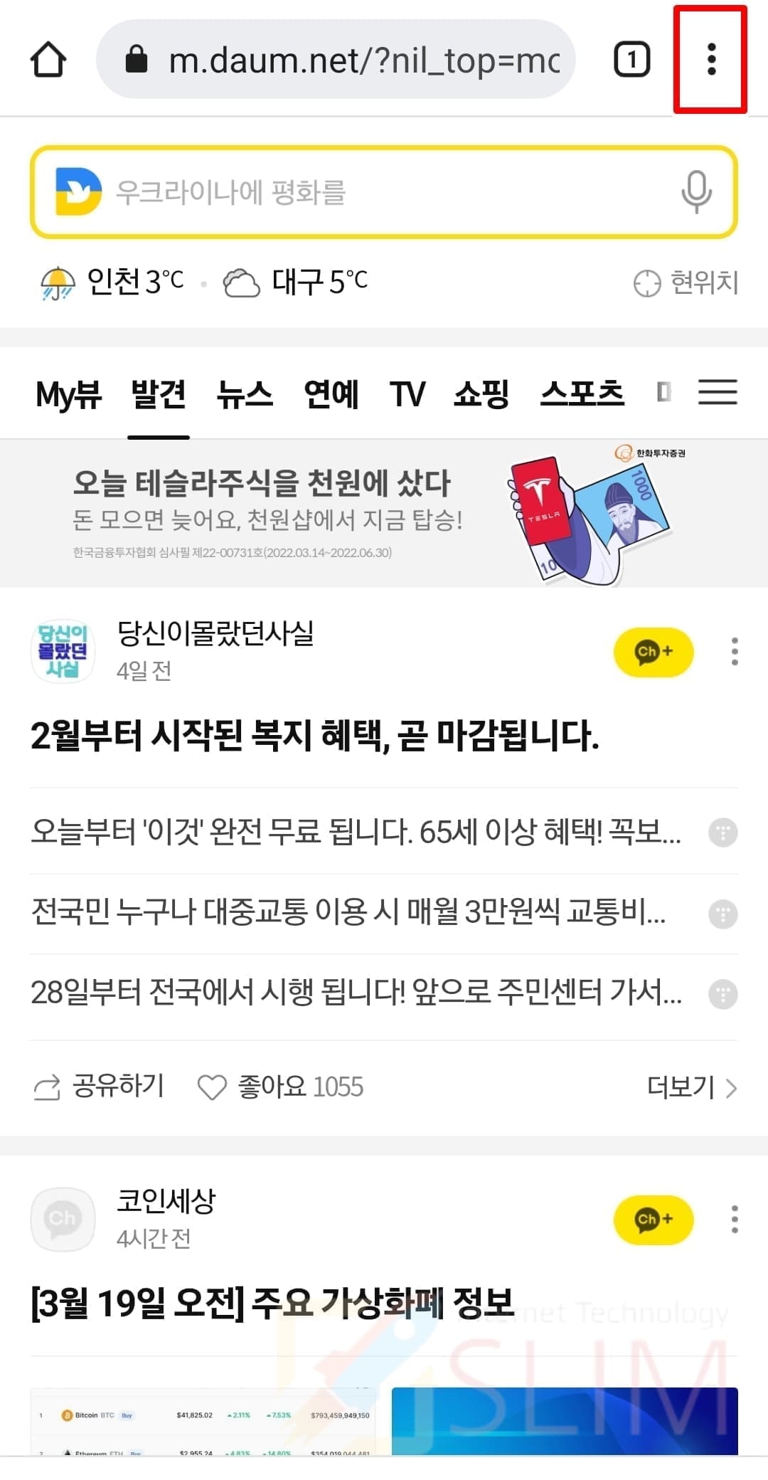 ▲ 모바일 크롬을 확인해보아도 다크모드로 잘 적용된 모습입니다. 단, 위의 다른 방법들과 마찬가지로 웹 컨텐츠영역이 다크모드로 바뀌지 않을 수 있으니 크롬flgs 설정을 함께 적용하시길 바랍니다.
