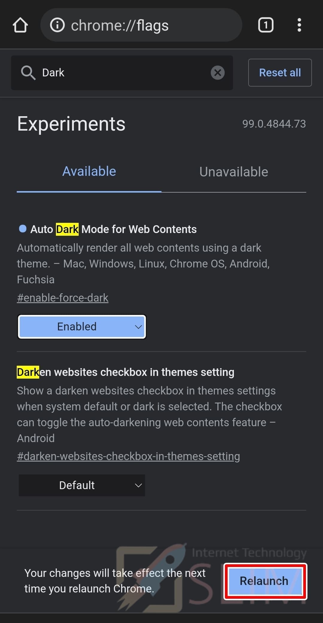 4. Auto Dark Mode for Web Contents 아래에서 Default를 클릭합니다.