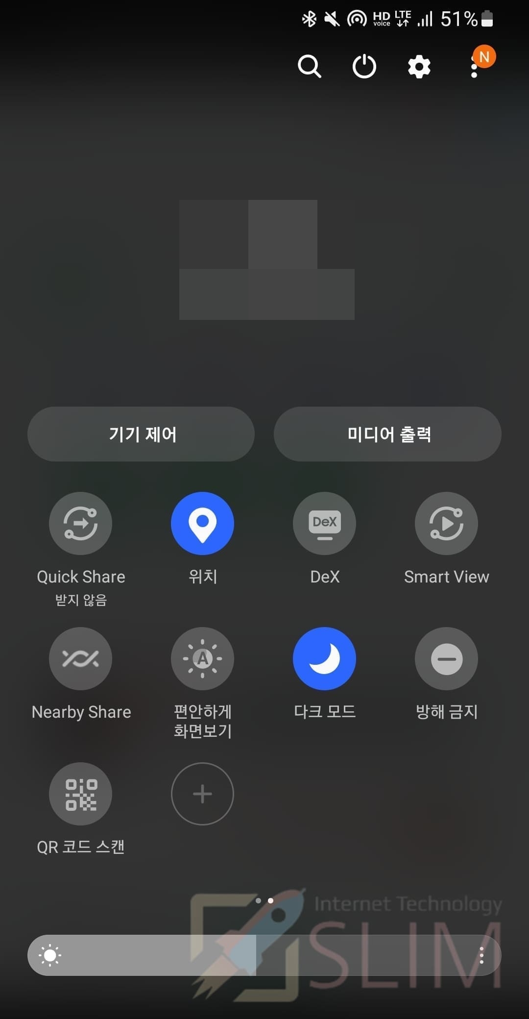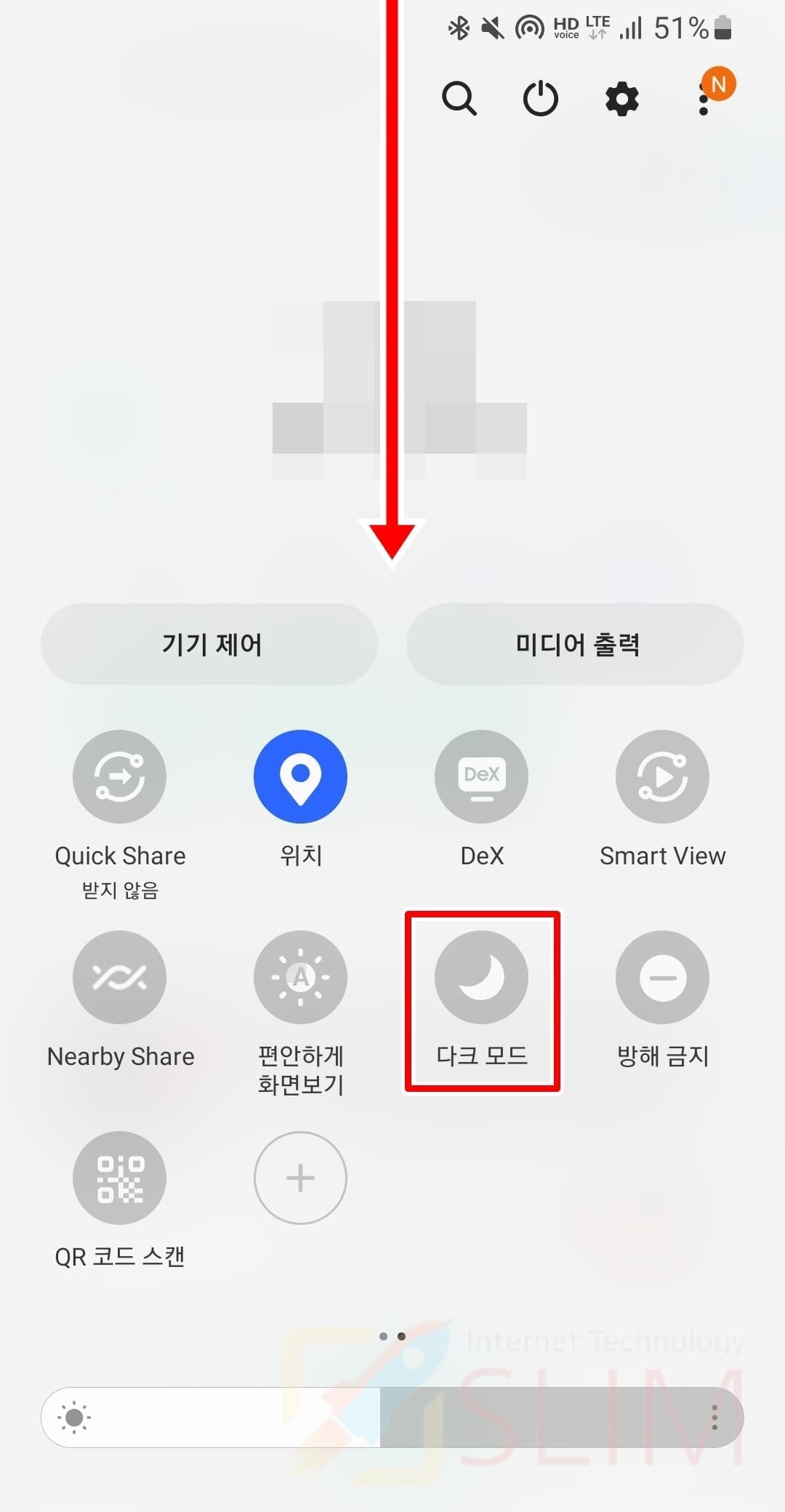 만약 상단바를 아래로 내렸을 때 빠른실행 메뉴에서 다크모드를 찾을 수 없다면 [설정 앱 > 디스플레이 > 다크모드 체크]로 사용하시길 바랍니다. (글 참고 → 갤럭시 다크모드 설정하는 방법 4가지 (예약시간 자동켜기))